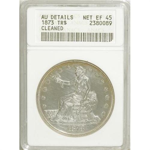 <B>1873 T$1 --Cleaned--ANACS. AU Details, Net XF45.</B></I> NGC Census: (1/104). PCGS Population (11/133). Mintage: 396,600. Numismedia Wsl. Price for NGC/PCGS coin in XF45: $192. (#7031)<BR><BR><B>Coin Engraver:</B> William Barber<BR><BR><b>Shipping:</b> Coins & Currency (<a target="_blank" href="http://www.heritageauctions.com/common/shipping.php">view shipping information</a>)