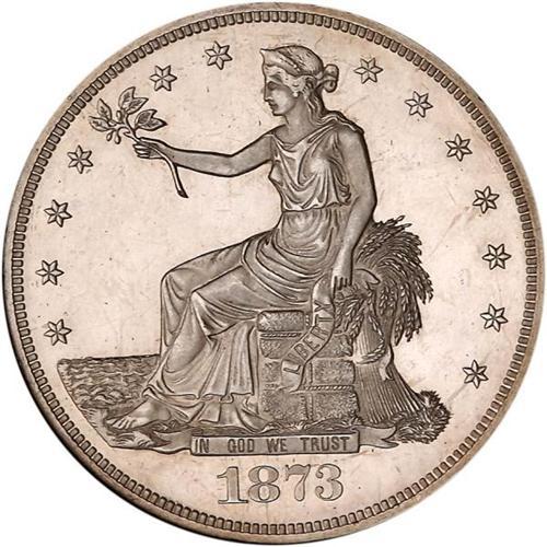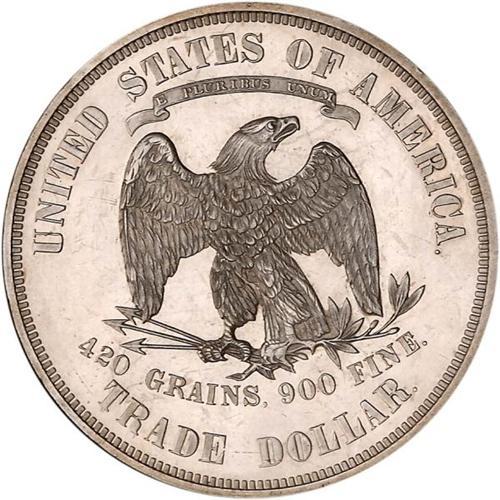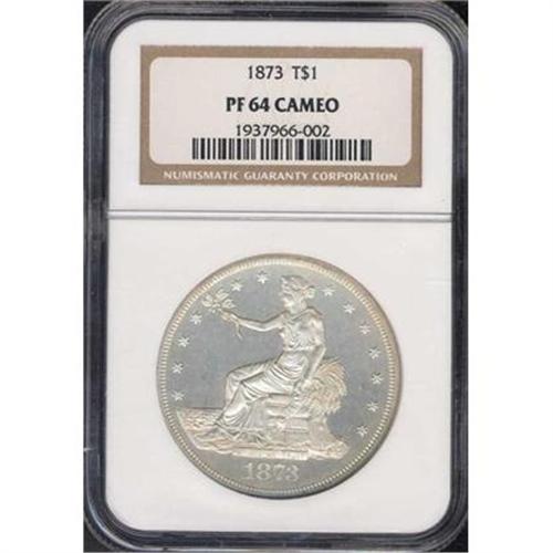 <b>1873 Trade Dollar. NGC graded PF64 CAM.</b> Proof mintage was only 865 pieces. Light milky white toned, yet basically silver-white in appearance. The few wispy hairlines do not detract from the overall pleasing eye appeal of this high-end Proof, a coin on the verge of Gem quality. Typical for well made Proofs, this has sharp devices that are coated in a layer of satin frost. The mirror field that surrounds creates the natural, two-tone appearance that charms the socks off of generations of coin buyers and makes it so endearing <b>(PCGS # 7031)</b>