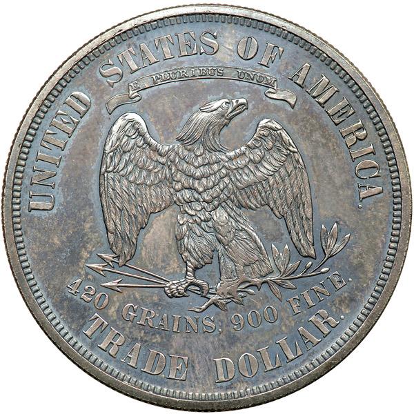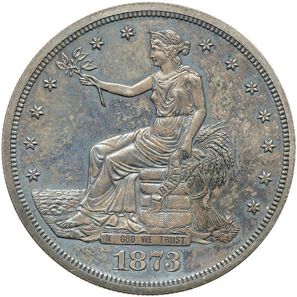 1873. Proof 60 plus. Uniformly toned. Only 865 Proofs struck. This is the first year Trade Dollars were struck. The series ended production in 1883, but Congress did not abolish the denomination until 1887.