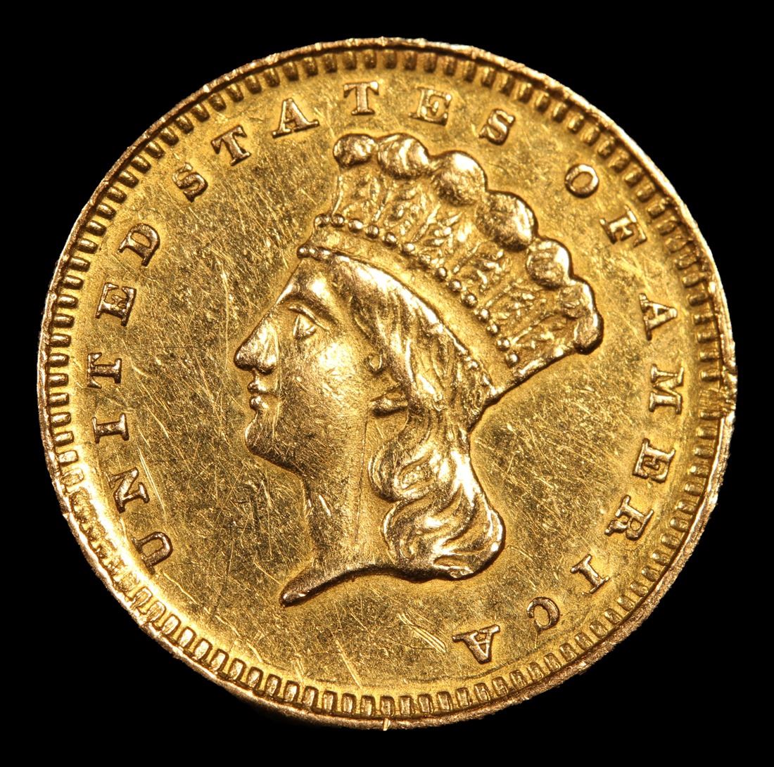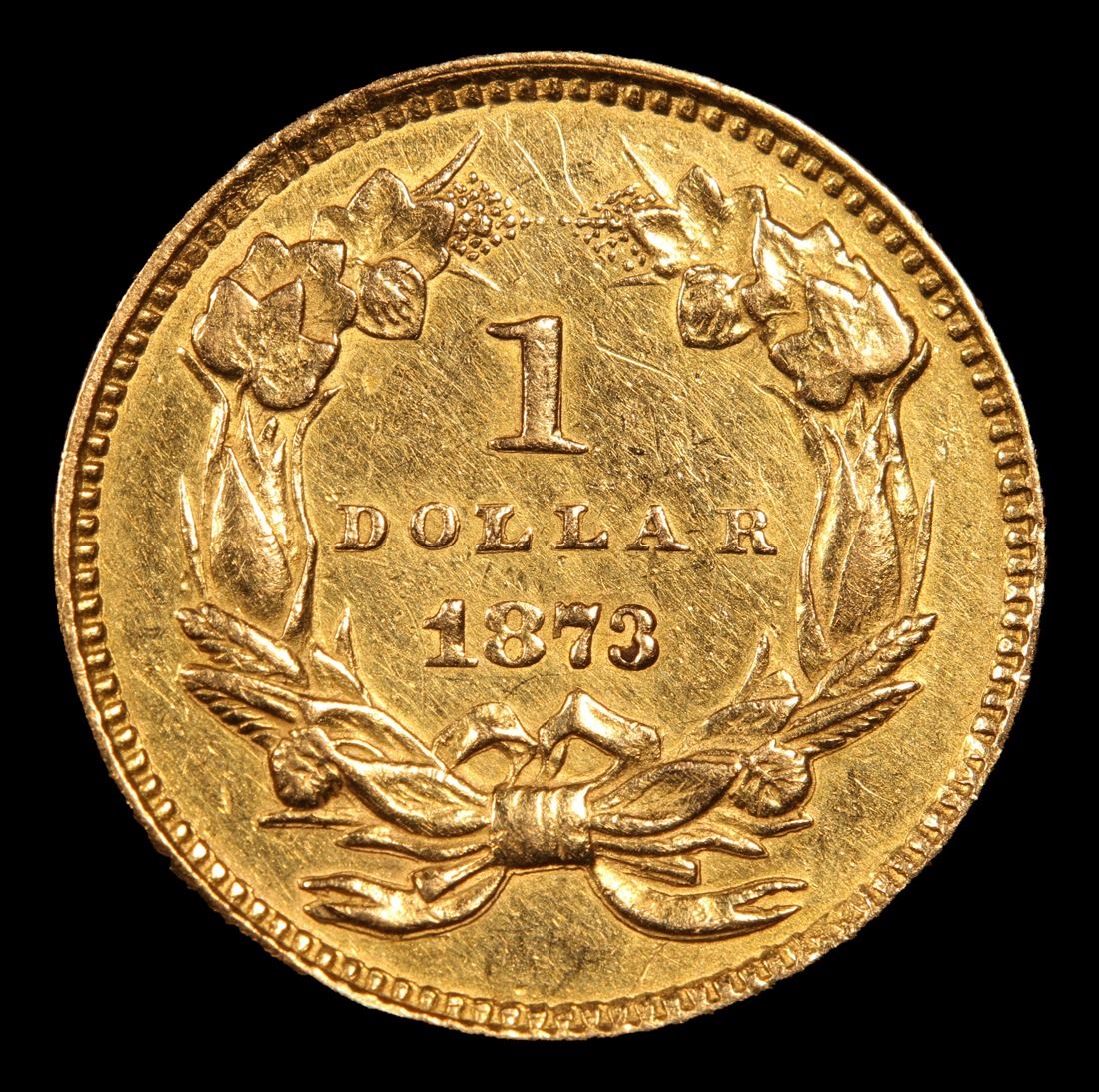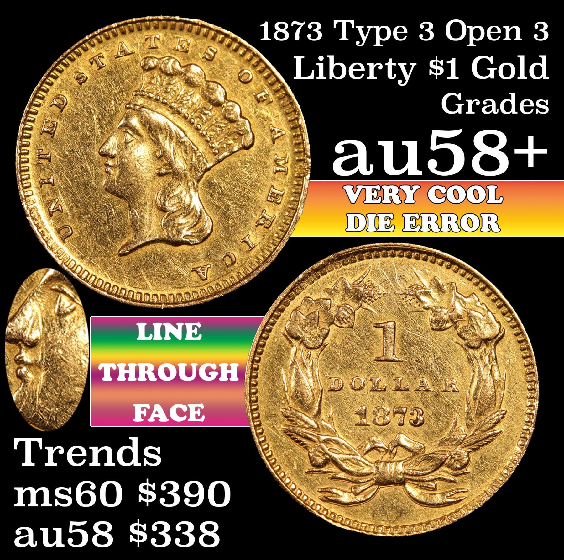 1873, Type 3 Open 3 Liberty Gold 1 Grades Choice AU/BU Slider+.