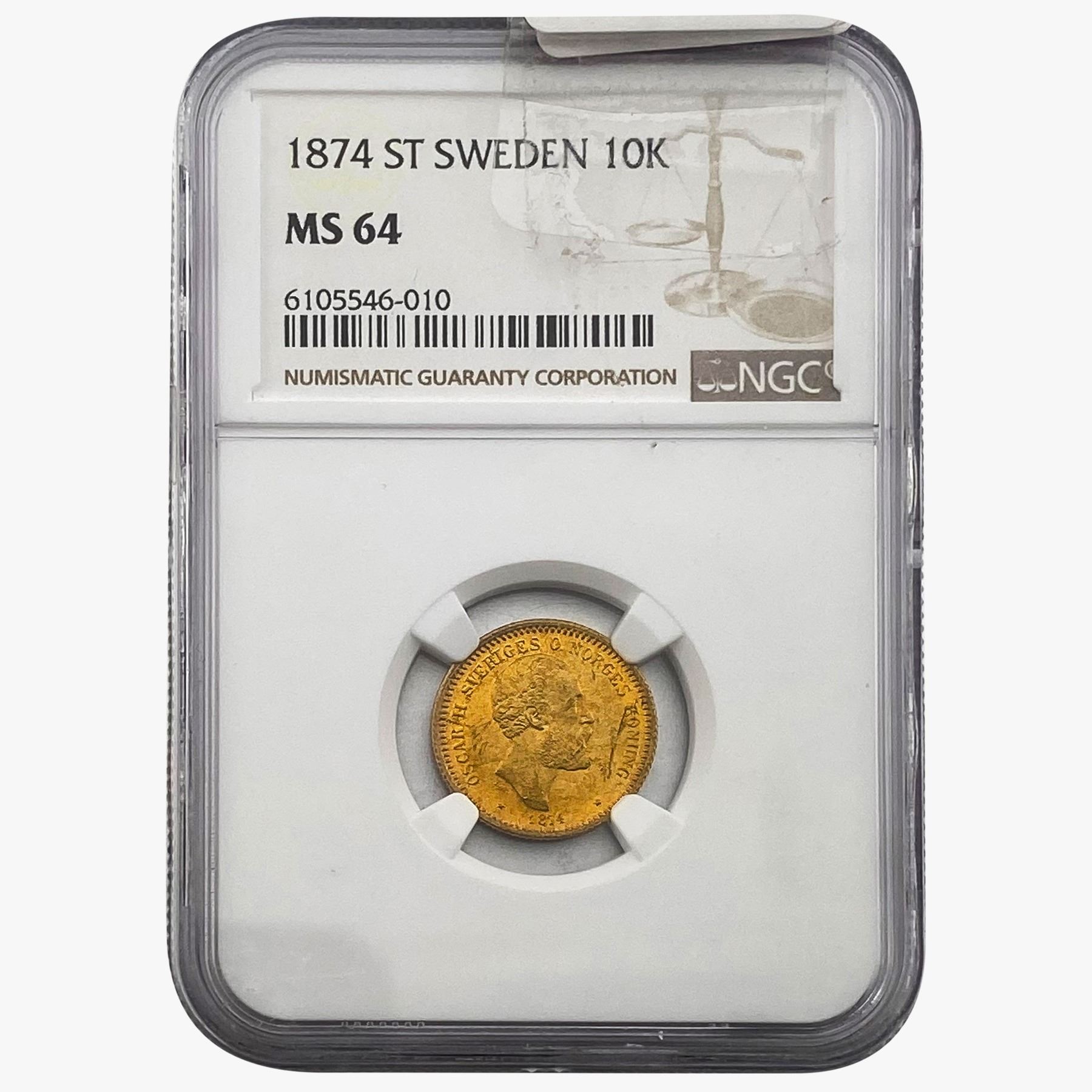 1874 0.1296oz Gold ST Sweden 10 Kronor NGC MS64