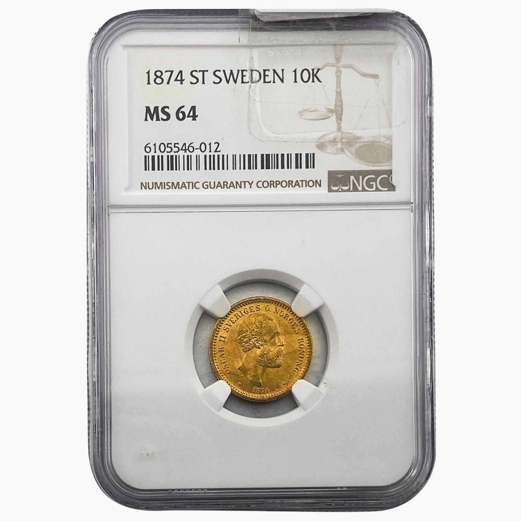 1874 0.1296oz Gold ST Sweden 10 Kronor NGC MS64