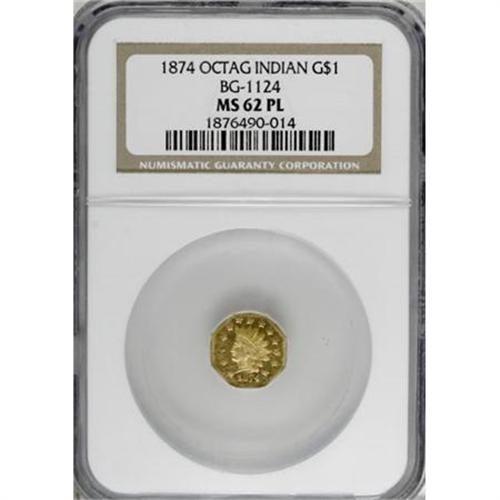 <B>1874 $1 Indian Octagonal 1 Dollar, BG-1124, High R.4 MS62 Prooflike NGC.</B></I> A gleaming and sharply struck survivor from this very scarce issue, moderately reflective beneath a degree of haze. This octagonal dollar issue proves challenging in better circulated and Mint State designations.<BR><BR><b>Shipping:</b> Coins & Currency (<a target="_blank" href="http://www.heritageauctions.com/common/shipping.php">view shipping information</a>)