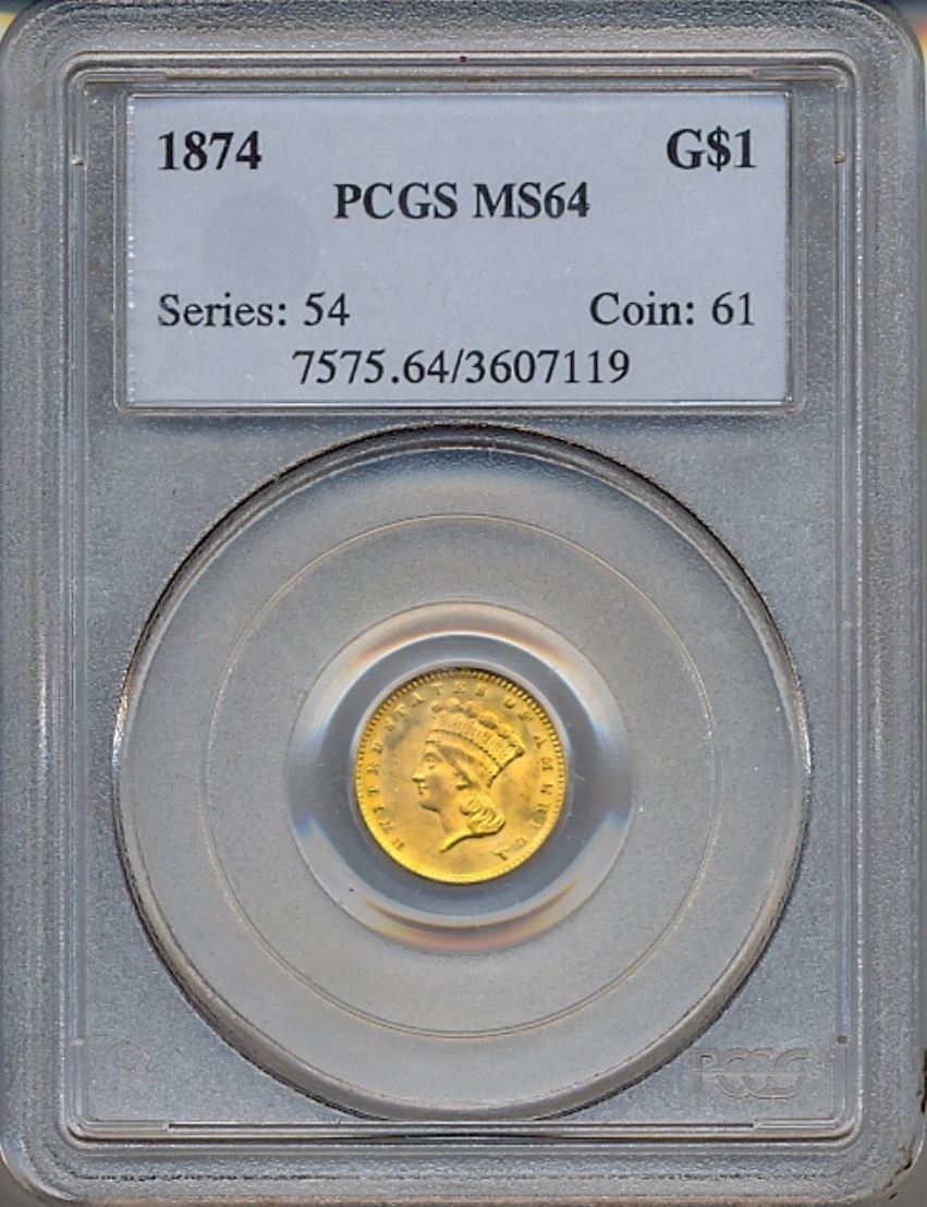 One 1874 $1 Gold Coin PCGS MS64.