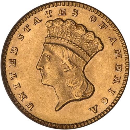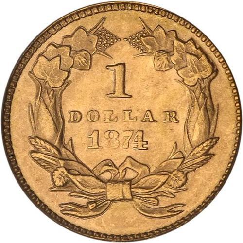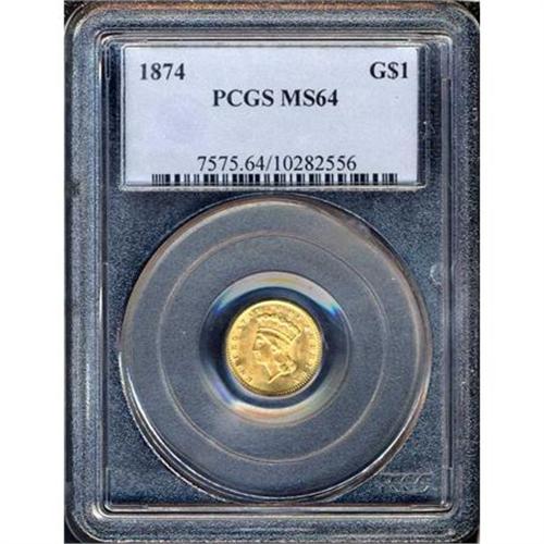 <b>1874 $1 Gold Indian. PCGS graded MS64.</b> Soft satin-like fields careening with lustrous golden color. As seen on many 1874 gold dollars (a plentiful issue) the word LIBERTY was accidentally lapped off the die when the mint workman cleared it of die clash marks. Other years are missing LIBERTY as well, but 1874 is noted for this <b>(PCGS # 7575)</b> <i>