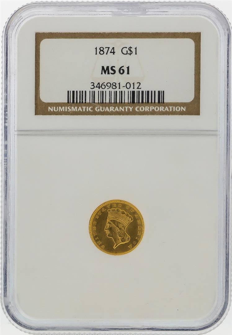One 1874 $1 Indian Princess Head Gold Dollar Coin NGC MS61. NGC Certified.