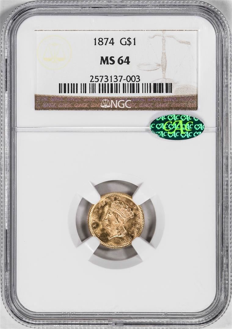 One 1874 $1 Indian Princess Head Gold Dollar Coin NGC MS64 CAC. NGC Certified.