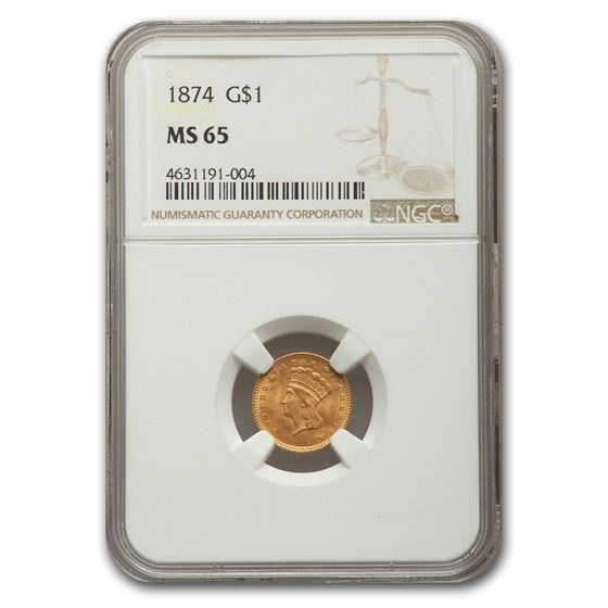 One piece 1874 $1 Liberty Head Gold MS-65 NGC