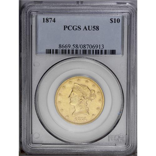 1874 $10 AU58 PCGS. The highpoint friction that keeps