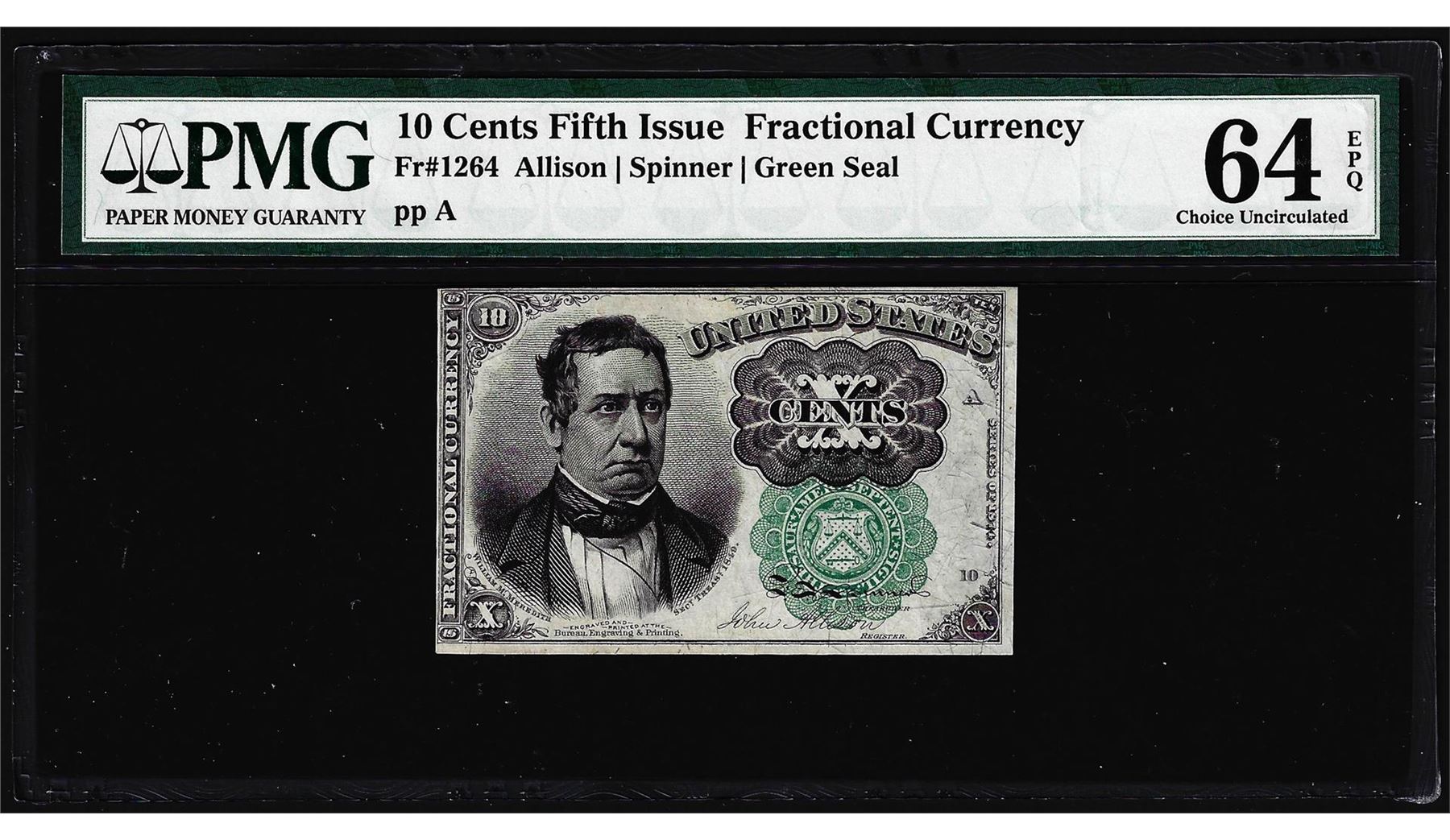 One 1874 10 Cent Fifth Issue Fractional Currency Note Fr.1264 PMG Choice Uncirculated 64EPQ. PMG Certified.