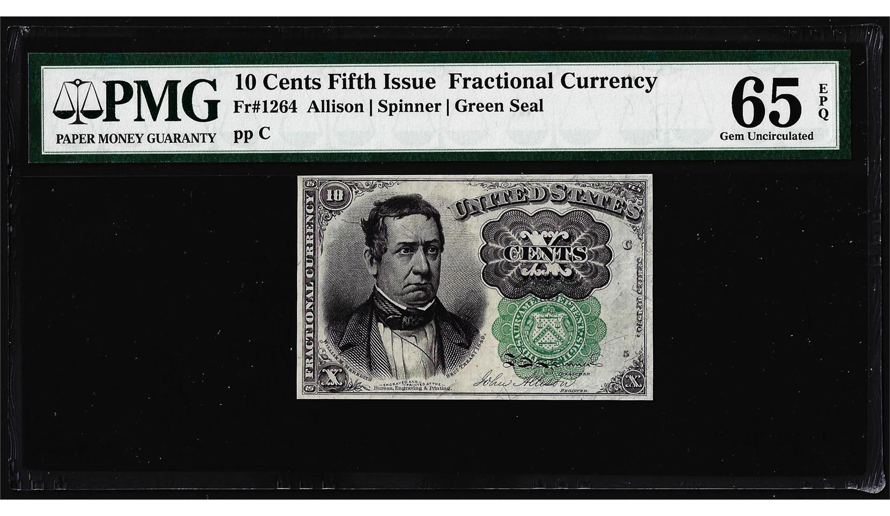One 1874 10 Cent Fifth Issue Fractional Currency Note Fr.1264 PMG Choice Uncirculated 65EPQ. PMG Certified.