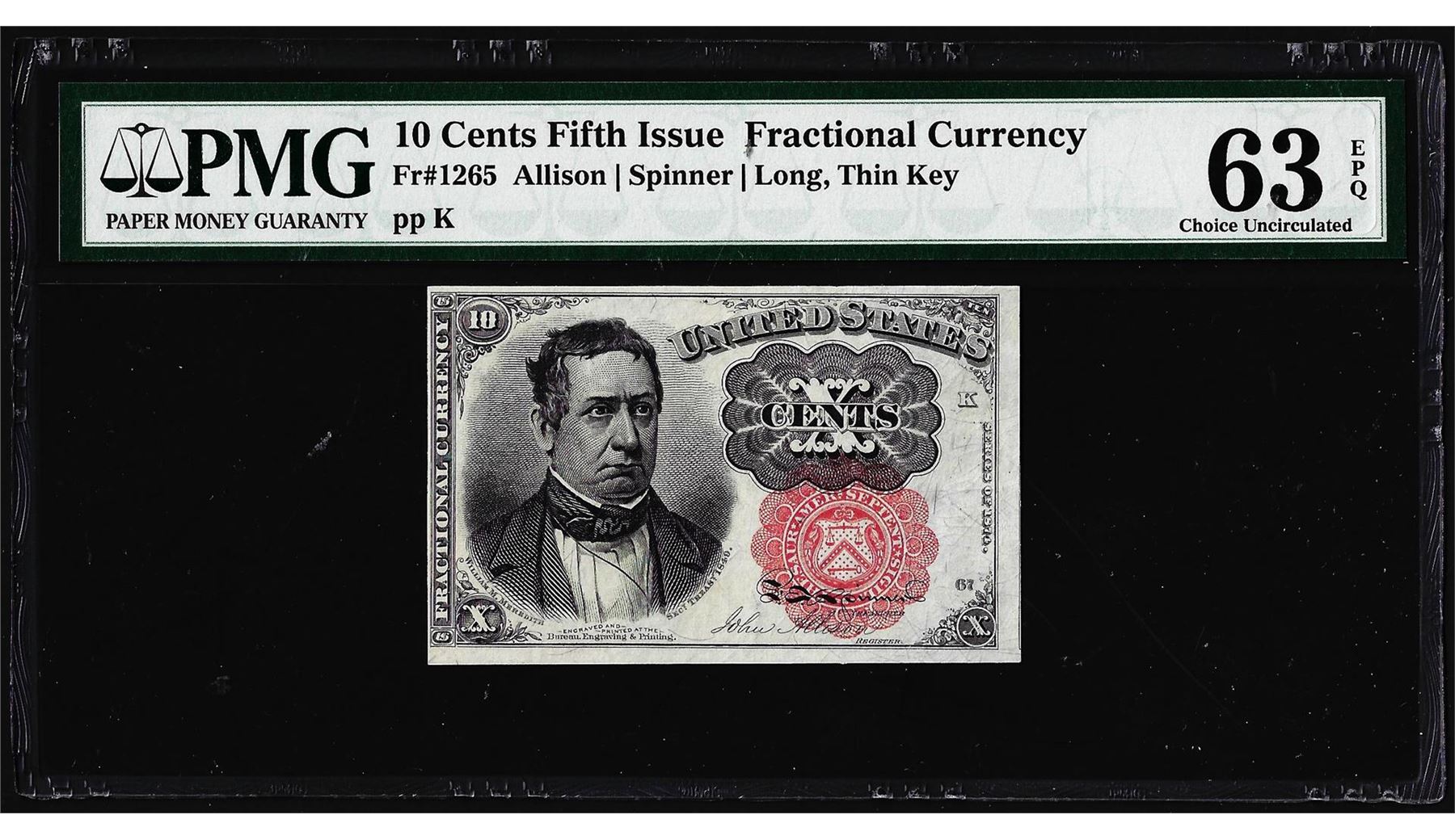 One 1874 10 Cent Fifth Issue Fractional Currency Note Fr.1265 PMG Choice Uncirculated 63EPQ. PMG Certified.