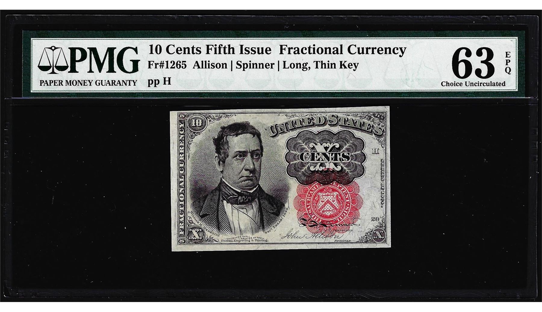 One 1874 10 Cent Fifth Issue Fractional Currency Note Fr.1265 PMG Choice Uncirculated 63EPQ. PMG Certified.