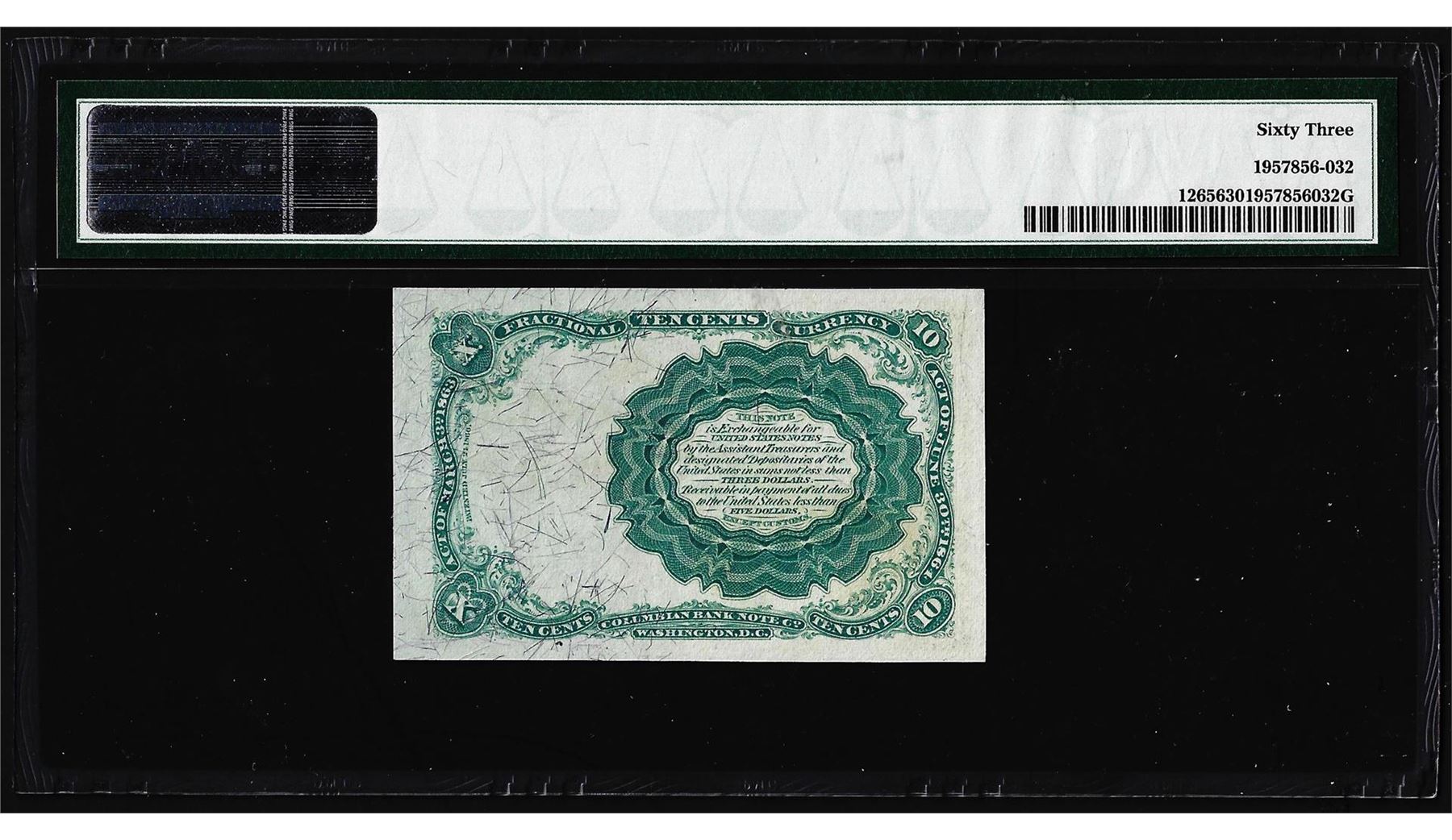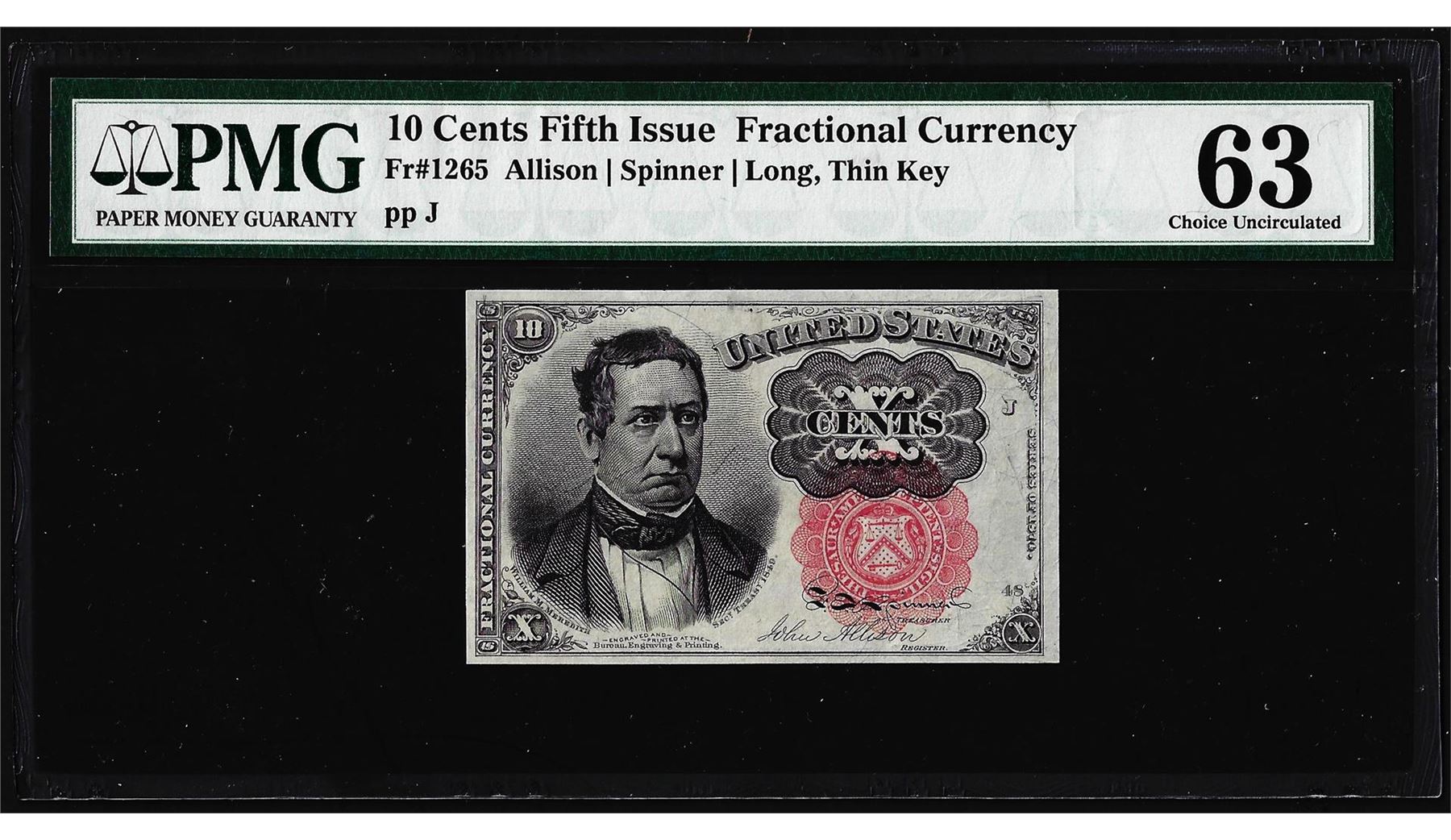 One 1874 10 Cent Fifth Issue Fractional Currency Note Fr.1265 PMG Choice Uncirculated 63. PMG Certified.
