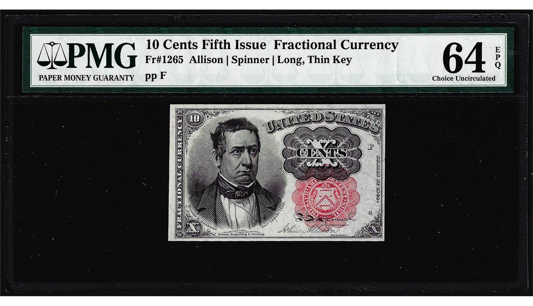 One 1874 10 Cent Fifth Issue Fractional Currency Note Fr.1265 PMG Choice Uncirculated 64EPQ. PMG Certified.