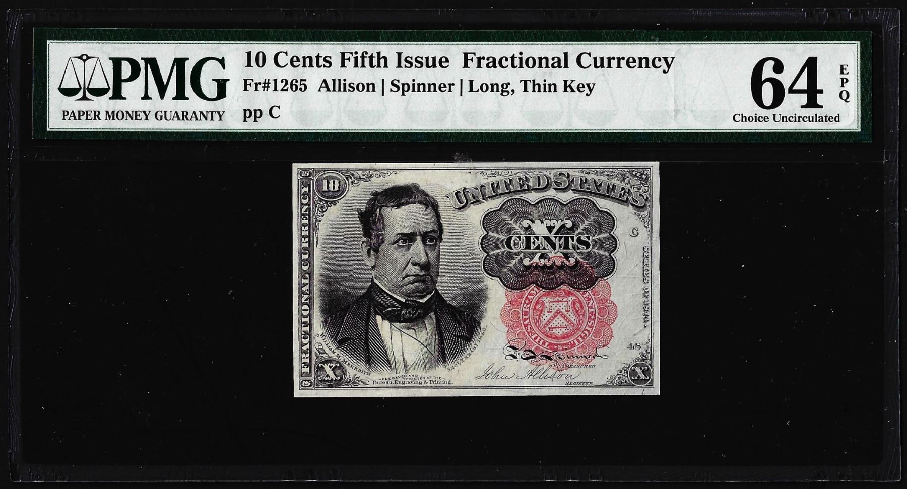 One 1874 10 Cent Fifth Issue Fractional Currency Note Fr.1265 PMG Choice Uncirculated 64EPQ.
