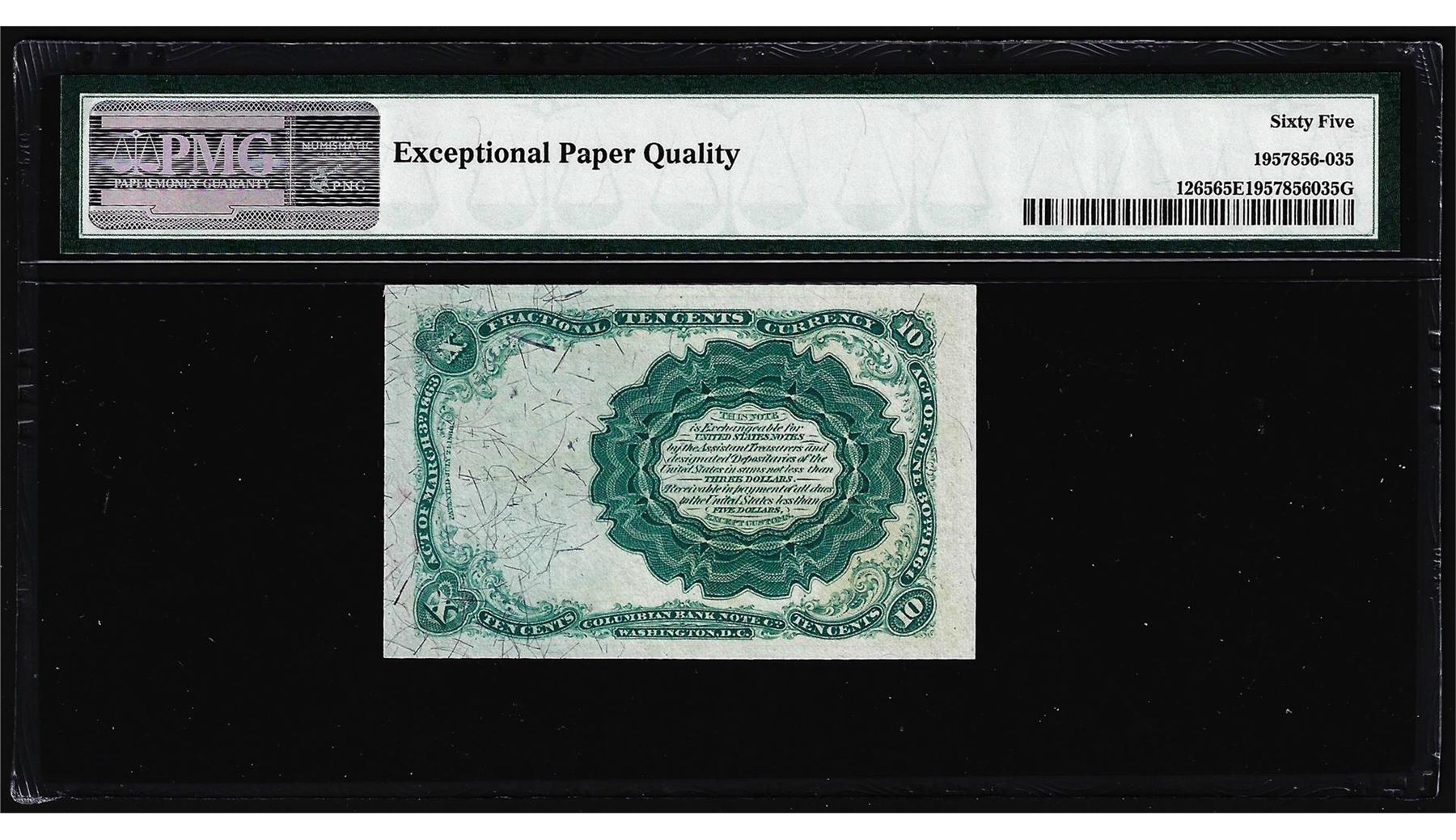 One 1874 10 Cent Fifth Issue Fractional Currency Note Fr.1265 PMG Gem Uncirculated 65EPQ. PMG Certified.