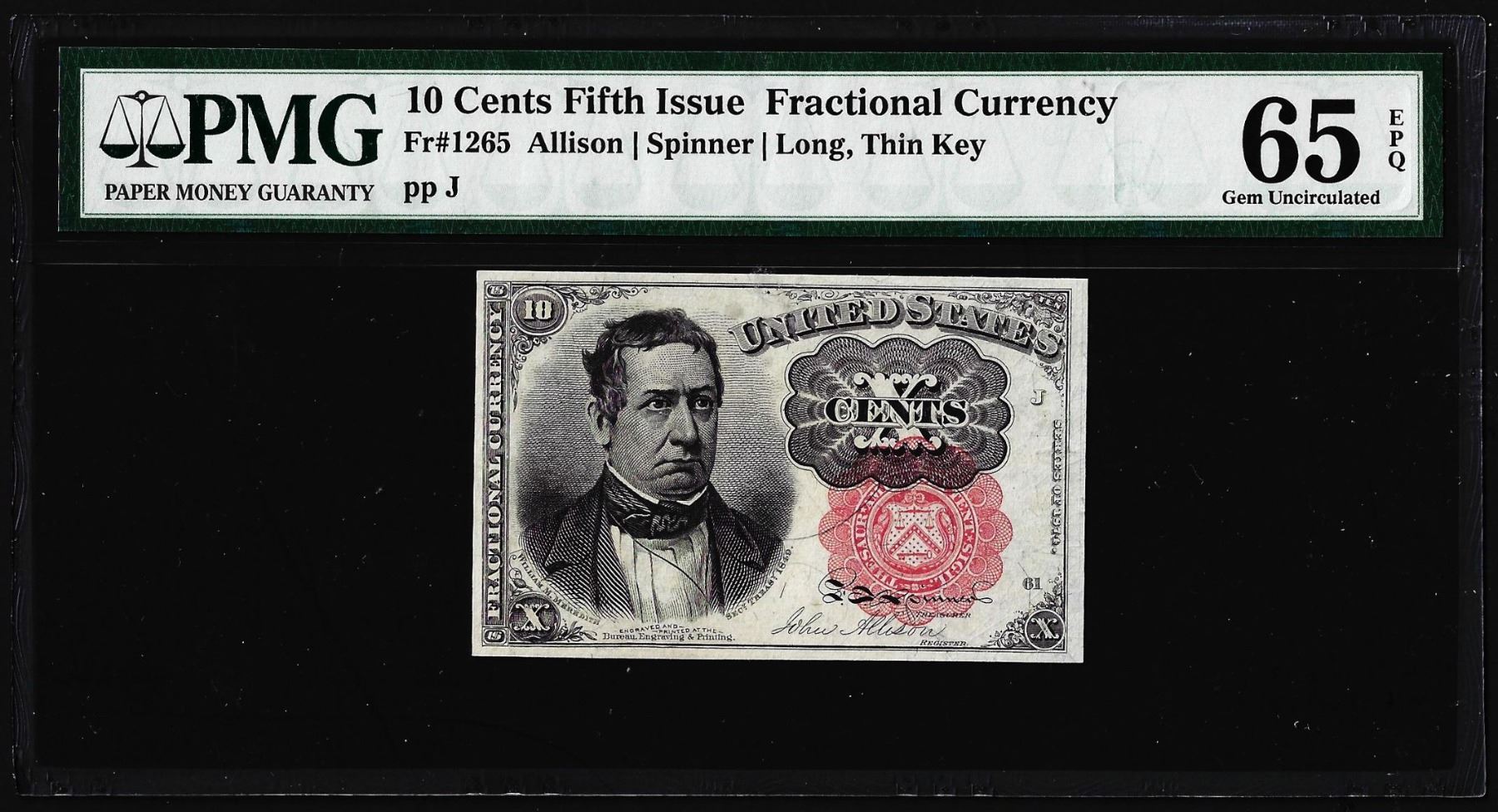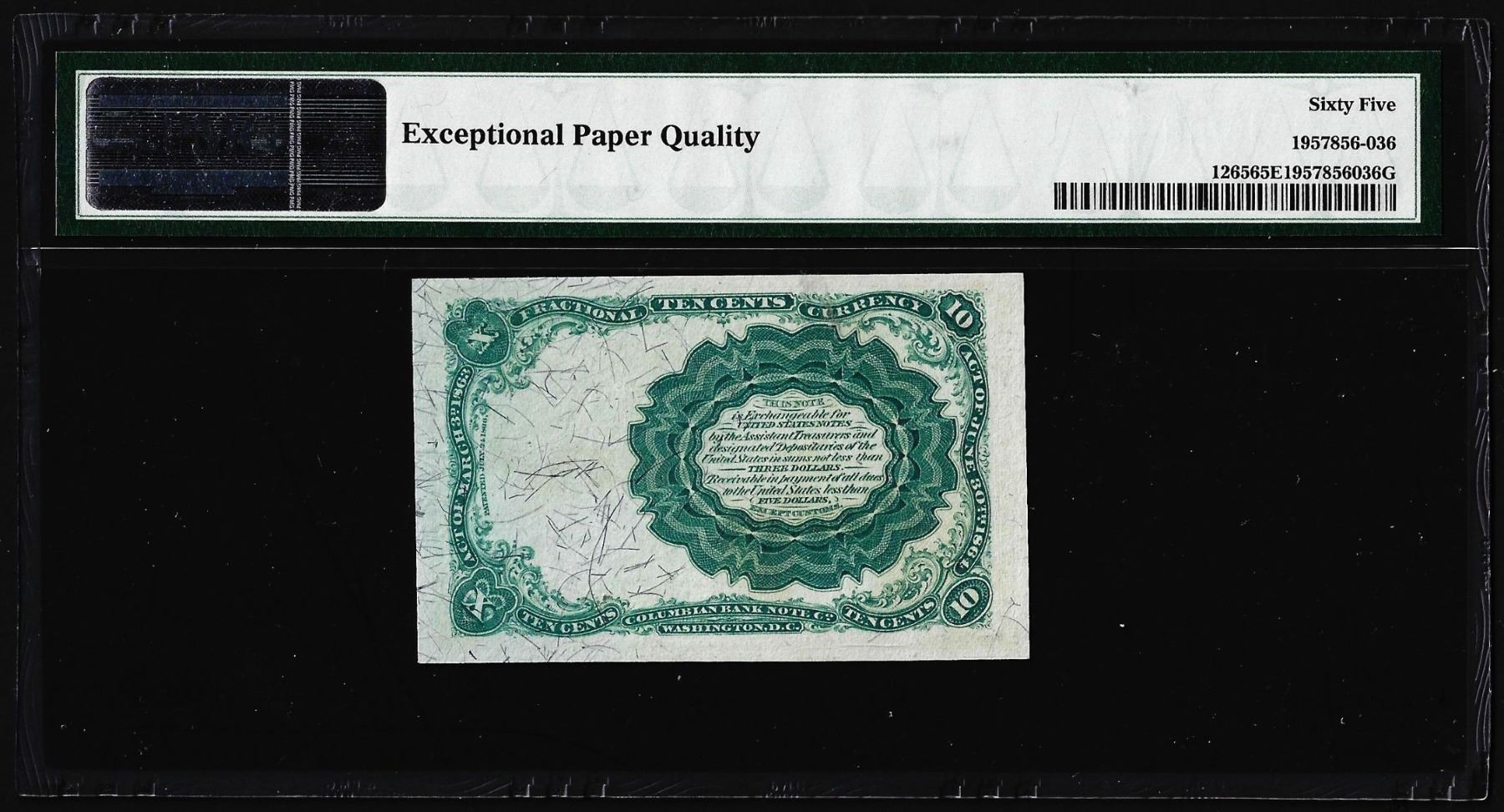 One 1874 10 Cent Fifth Issue Fractional Currency Note Fr.1265 PMG Gem Uncirculated 65EPQ.