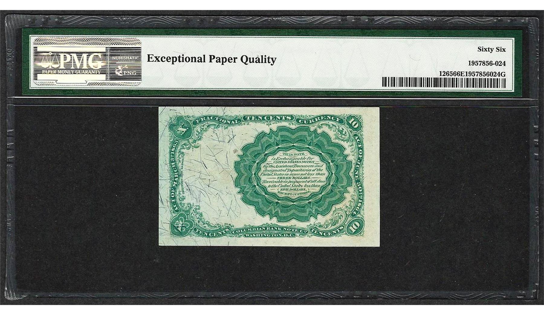One 1874 10 Cent Fifth Issue Fractional Currency Note Fr.1265 PMG Gem Uncirculated 66EPQ. PMG Certified.