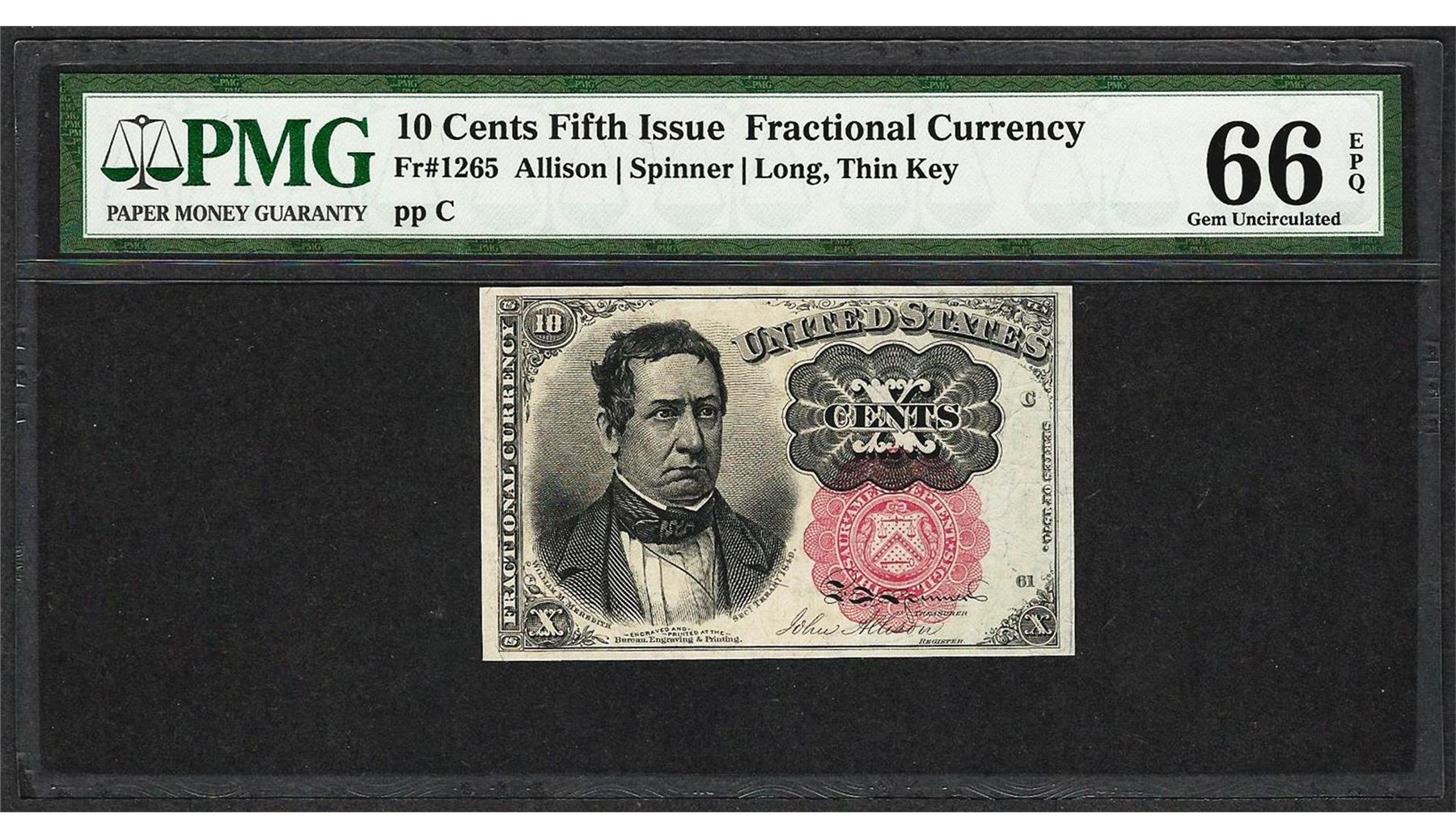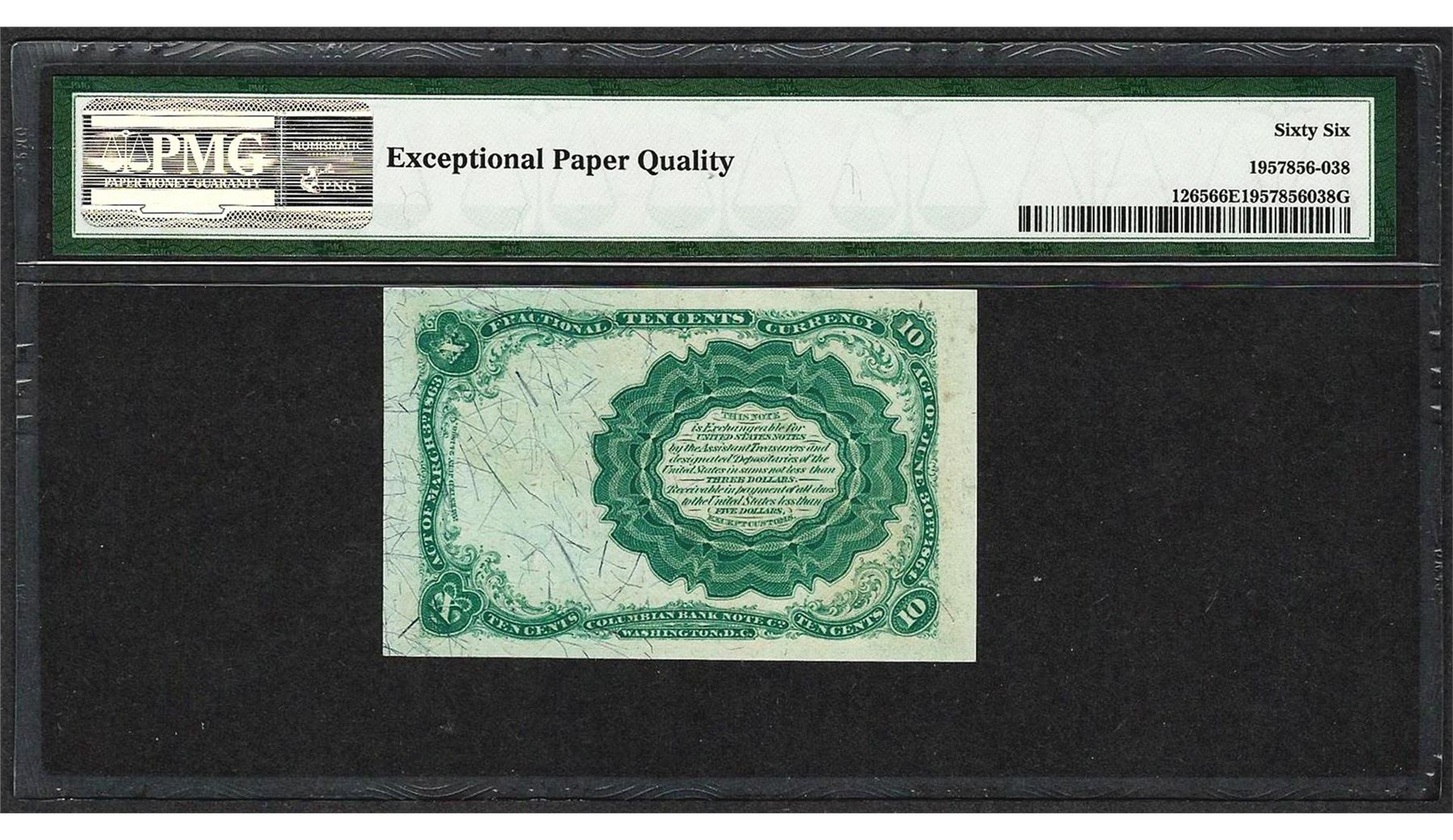 One 1874 10 Cent Fifth Issue Fractional Currency Note Fr.1265 PMG Gem Uncirculated 66EPQ. PMG Certified.
