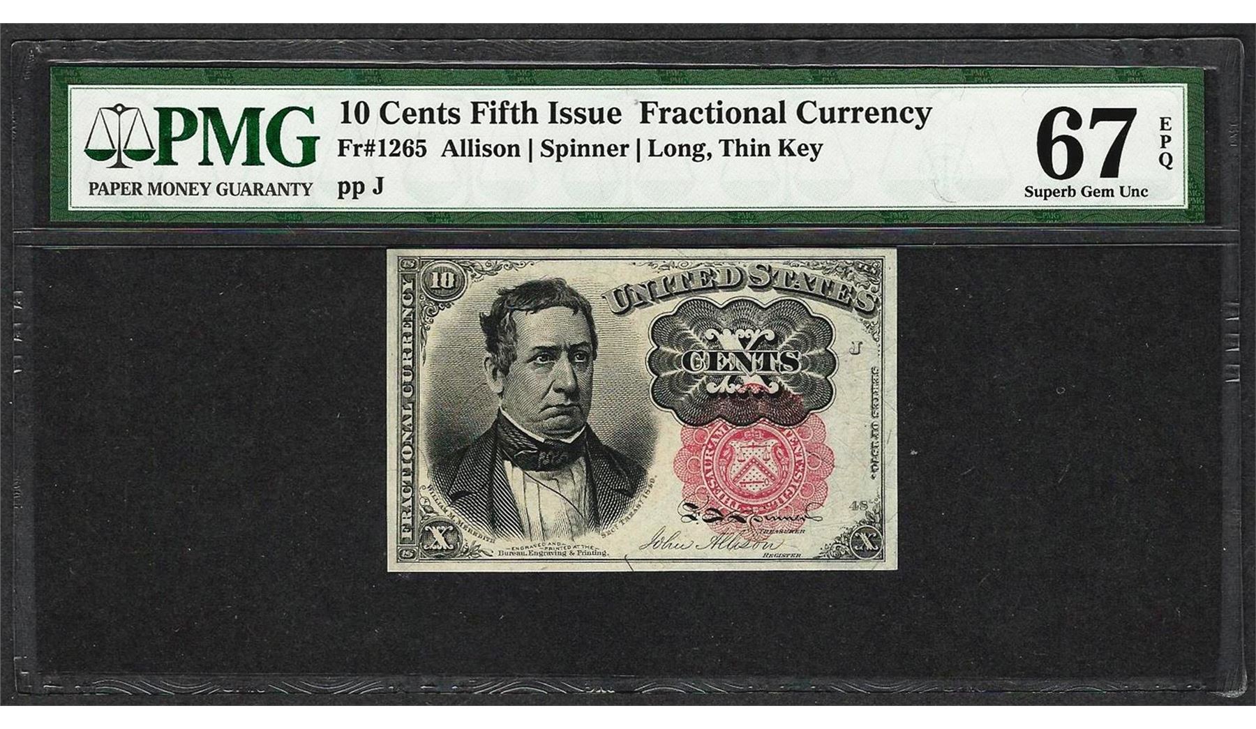 One 1874 10 Cent Fifth Issue Fractional Currency Note Fr.1265 PMG Superb Gem Unc 67EPQ. PMG Certified.