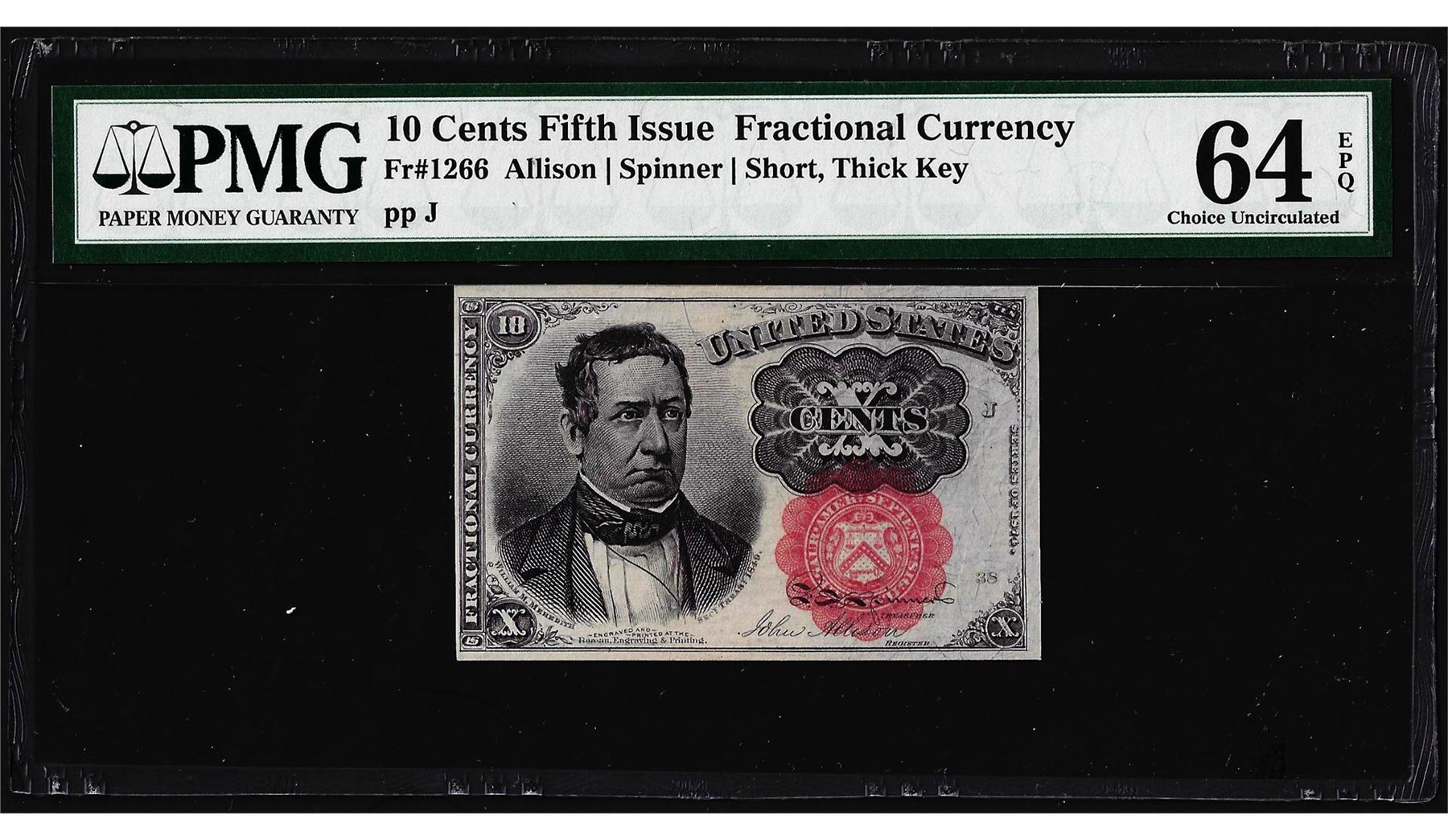 One 1874 10 Cents Fifth Issue Fractional Currency Note Fr.1266 PMG Choice Unc. 64EPQ. PMG Certified.