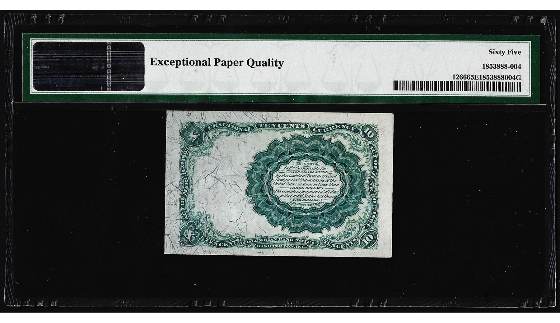 One 1874 10 Cents Fifth Issue Fractional Currency Note Fr.1266 PMG Gem Uncirculated 65EPQ. PMG Certified.