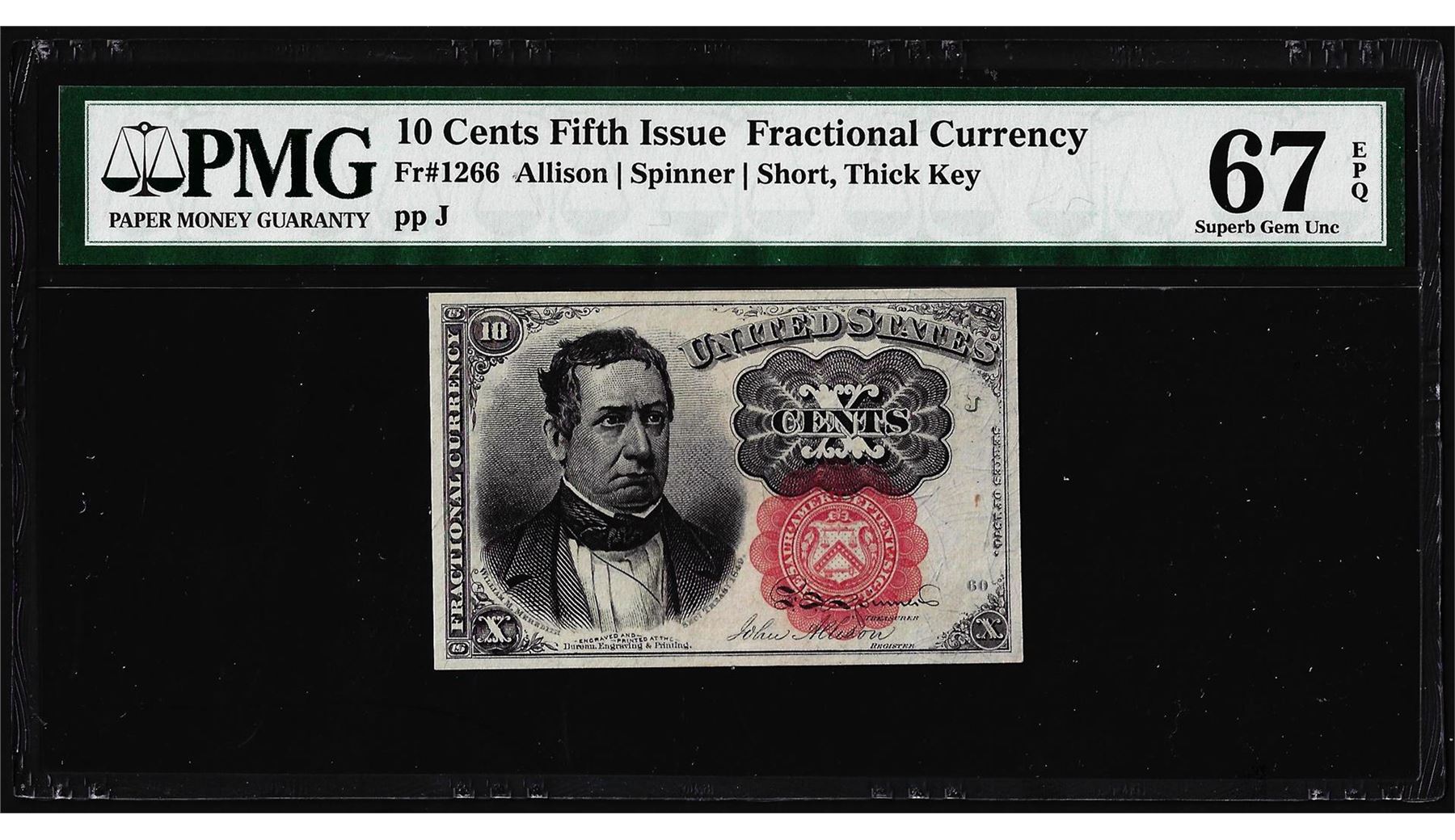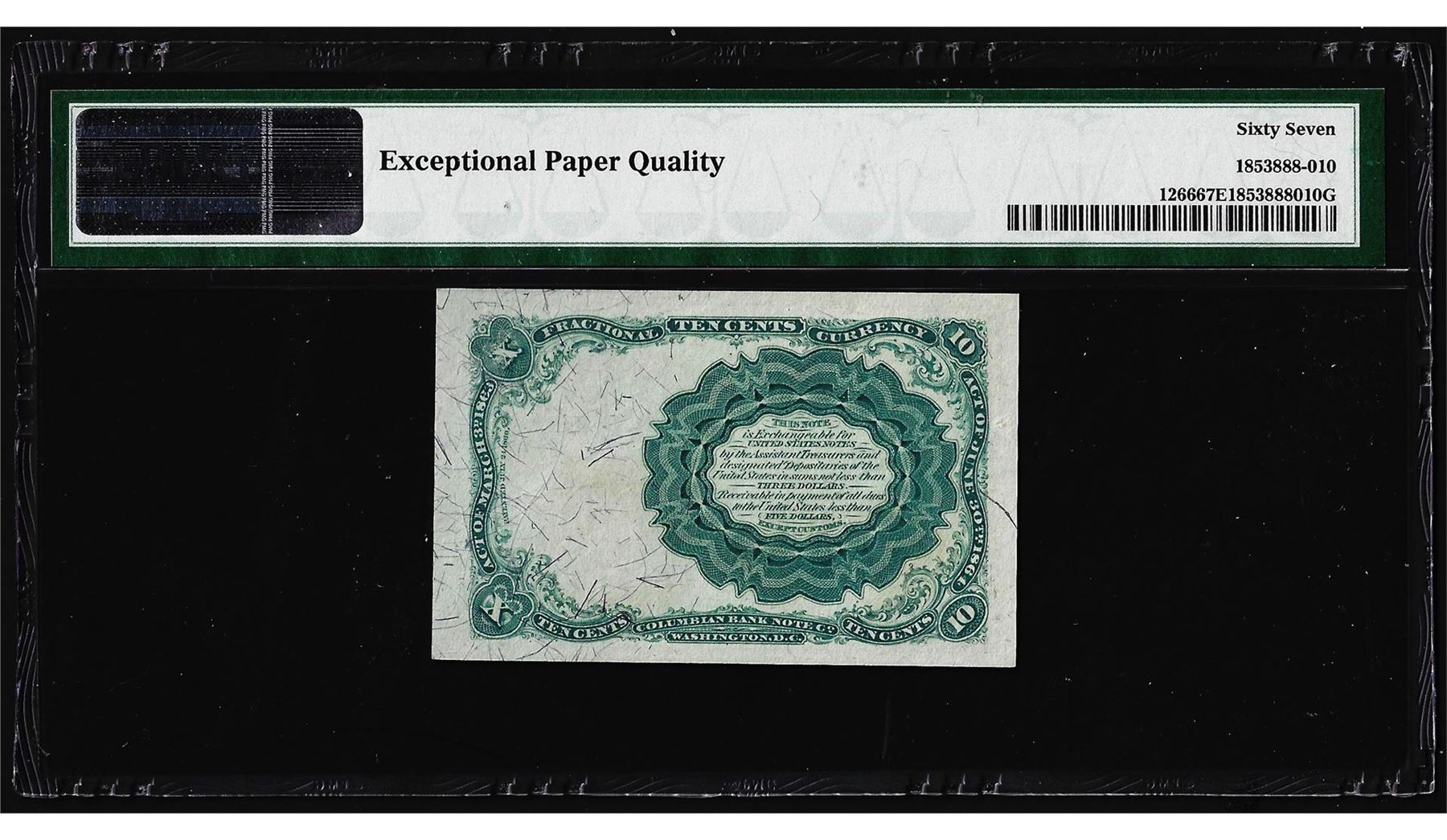 One 1874 10 Cents Fifth Issue Fractional Currency Note Fr.1266 PMG Superb Gem Unc 67EPQ. PMG Certified.