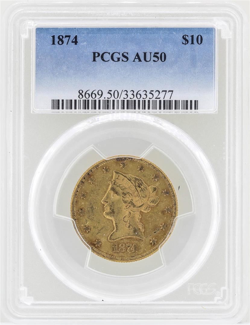One 1874 $10 Liberty Head Eagle Gold Coin PCGS AU50. PCGS Graded.