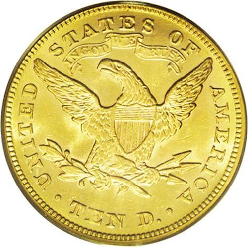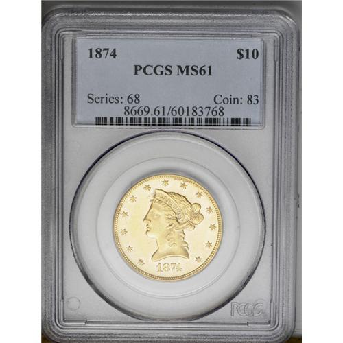 <B>1874<$10> MS61 PCGS.</B></I> This is a scarce opportunity to acquire a nicely lustrous and sharply struck Mint State example of this scarcer issue. During their nearly 20 years, PCGS has only certified 16 finer examples of this issue. The T in LIBERTY has aqua toning and a few moderate marks, but the surfaces are otherwise pleasing and relatively mark-free. Population: 12 in 61, 16 finer (6/06).