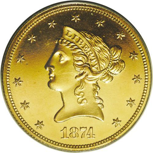<B>1874<$10> PR64 Cameo ANACS.</B></I> A glorious near-Gem proof with excellent cameo contrast on both sides. The devices have noticeable frosty luster, and they are framed by deeply mirrored fields. Both sides have excellent medium yellow-gold color. A few minute hairlines, including one across Liberty's cheek are all that prevent a higher grade for this coin. The overall presentation is one of excellent aesthetic appeal.<BR> It is believed that, today, only about half of the original 20 coin mintage survive, and most of that small quantity are in lower grades or impaired in one manner or another. Past estimates of survival have ranged from five to ten coins. Walter Breen suggested that eight to ten coins exist, David Akers said that only six or seven survive, and a past Heritage offering suggested that perhaps as few as five proof examples remain today. A review of our past auction archives indicate that this is only the second proof example of this date that we have offered for sale in any of our auctions.