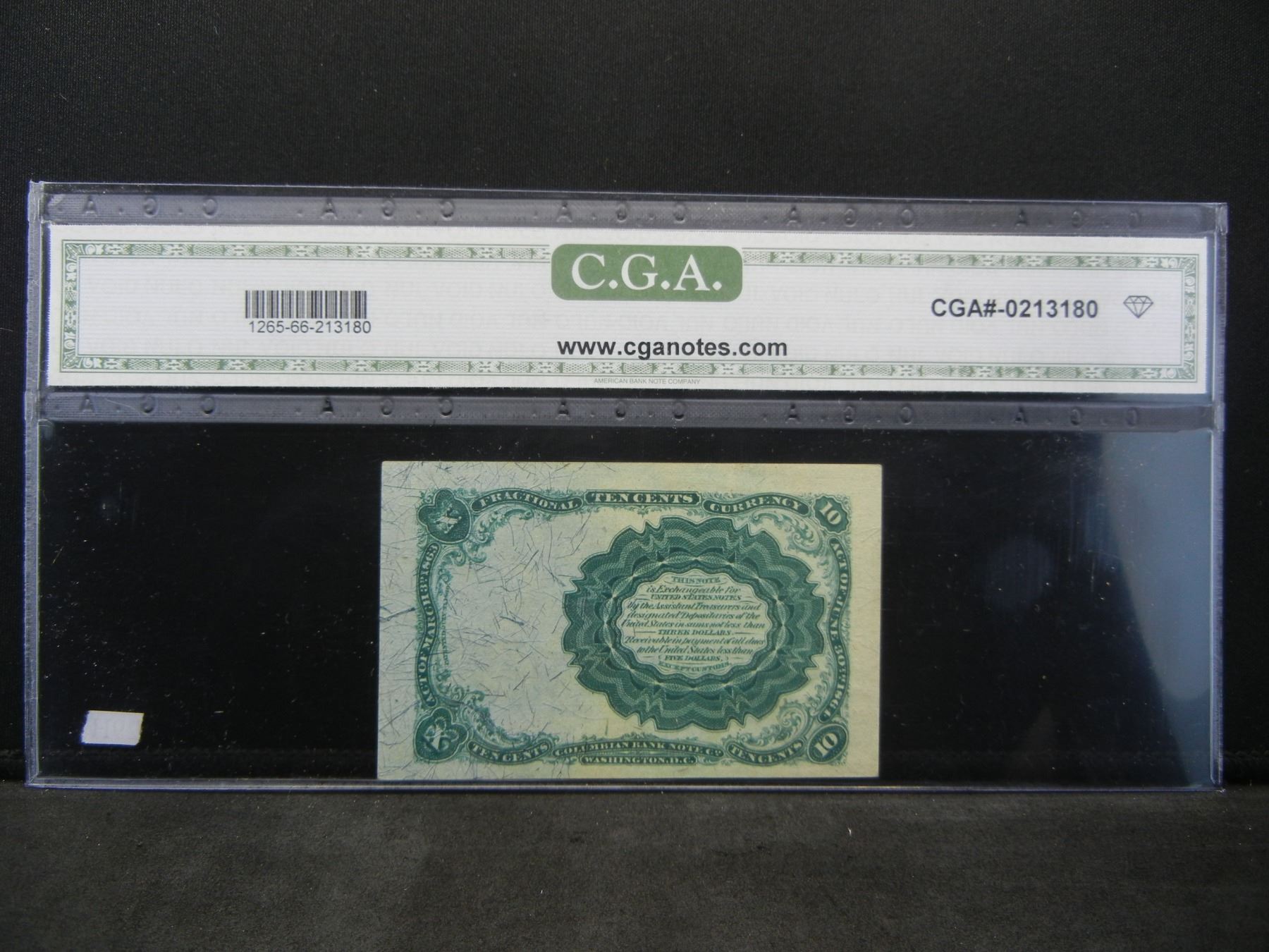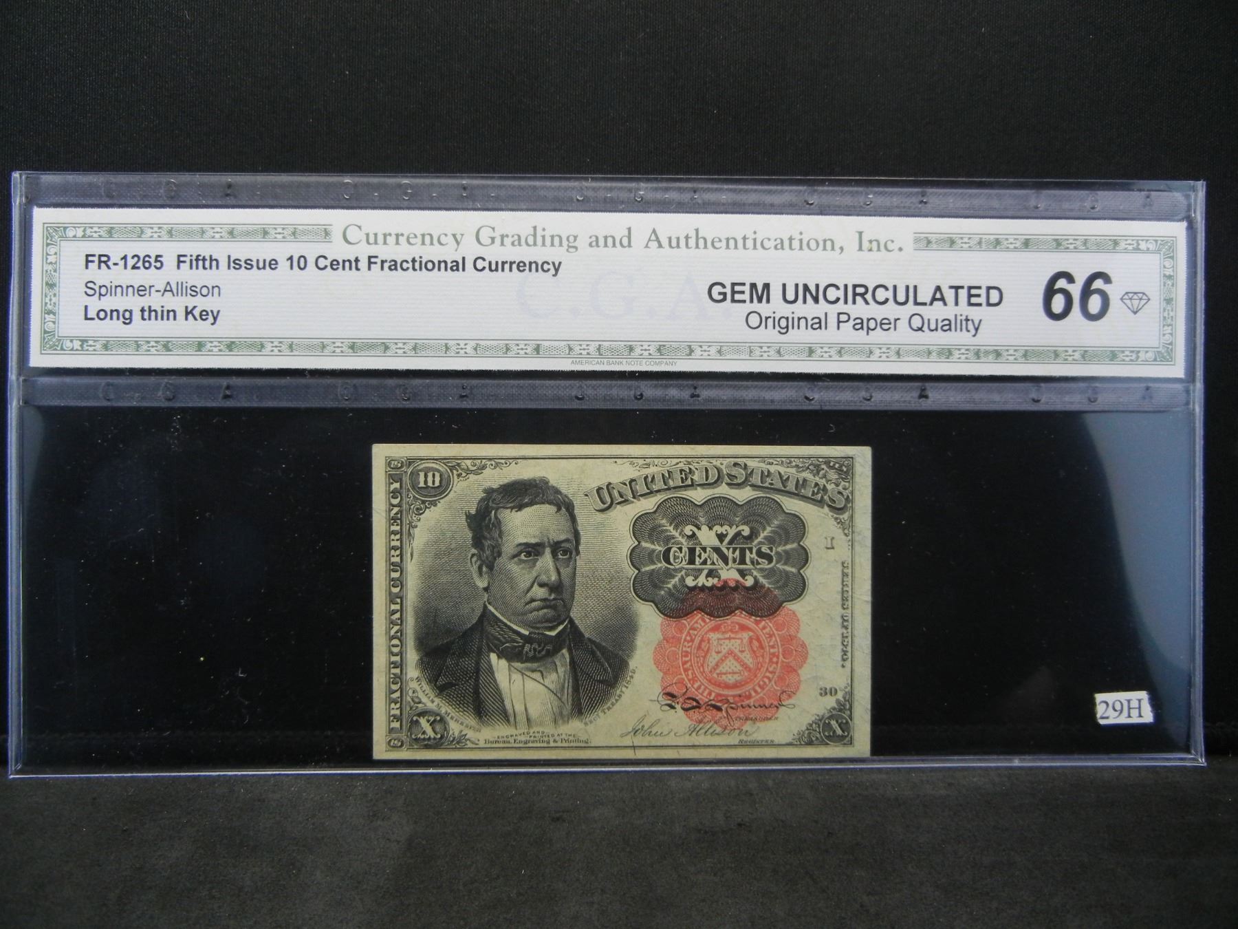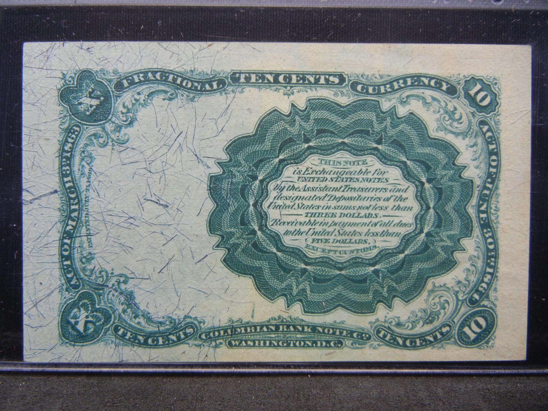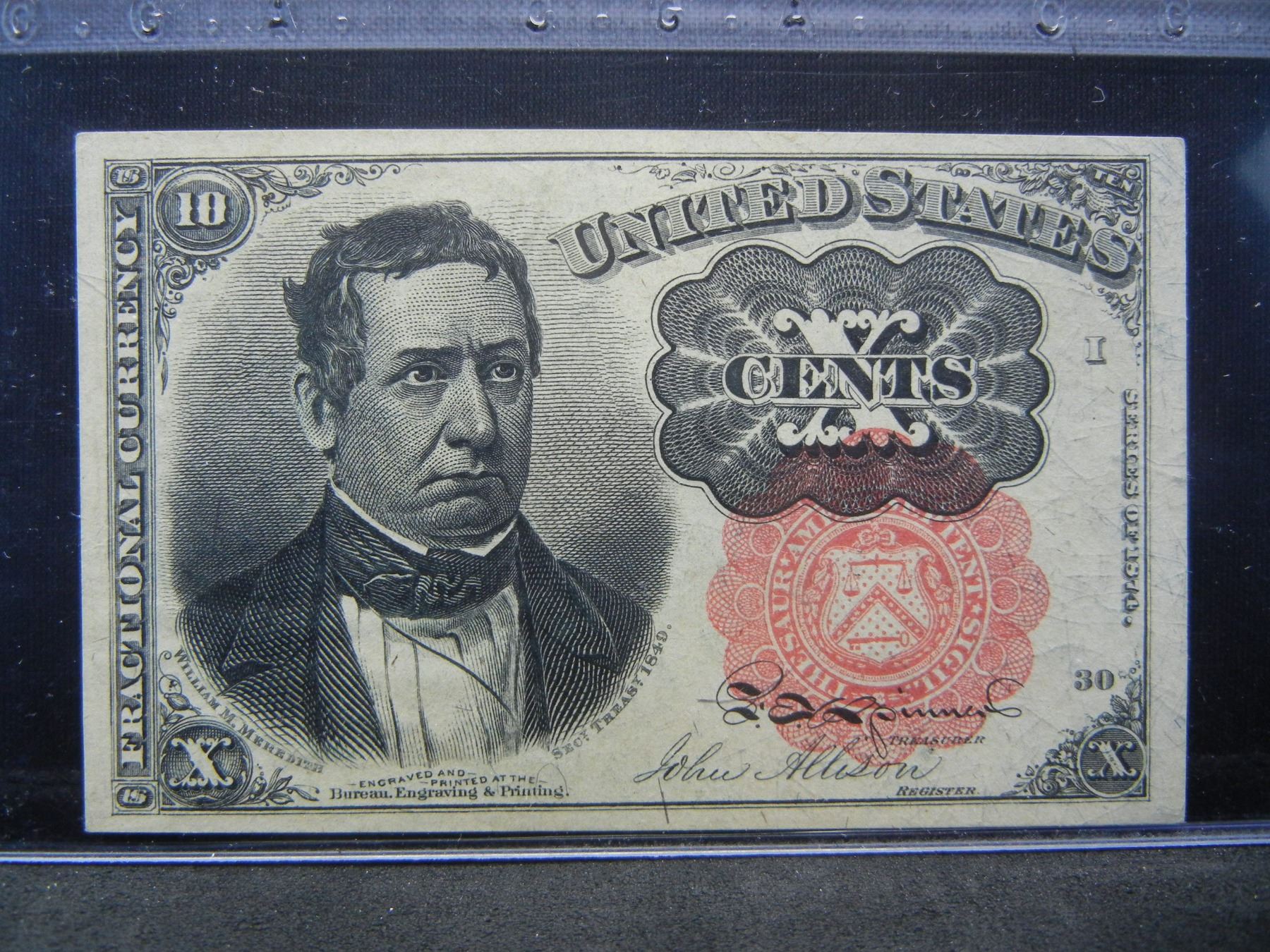 1874 10 cent fractional. GEM UNC 66 CHOICE. Long thin key, CGA graded