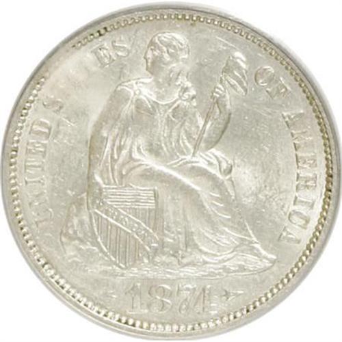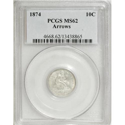 <B>1874 10C Arrows MS62 PCGS.</B></I> . PCGS Population (25/129). NGC Census: (20/106). Mintage: 2,940,000. Numismedia Wsl. Price for NGC/PCGS coin in MS62: $590. (#4668)<BR><BR><B>Coin Engraver:</B> Christian Gobrecht<BR><BR><b>Shipping:</b> Coins & Currency (<a target="_blank" href="http://www.heritageauctions.com/common/shipping.php">view shipping information</a>)