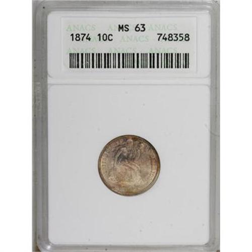 <B>1874 10C Arrows MS63 ANACS.</B></I> NGC Census: (27/78). PCGS Population (33/92). Mintage: 2,940,000. Numismedia Wsl. Price for NGC/PCGS coin in MS63: $840. (#4668)<BR><BR><B>Coin Engraver:</B> Christian Gobrecht<BR><BR><b>Shipping:</b> Coins & Currency (<a target="_blank" href="http://www.heritageauctions.com/common/shipping.php">view shipping information</a>)