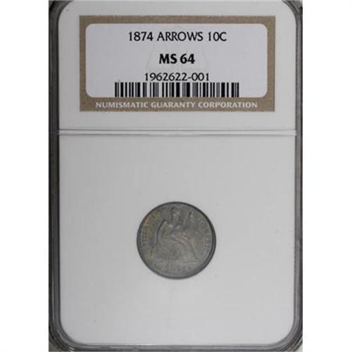 <B>1874 10C Arrows MS64 NGC.</B></I> Boldly struck with faint die clash marks noted in the left obverse field. Dappled sky-blue, rose, and grayish-tan coloration occurs over each side. Some wispy obverse field marks and slightly reduced luster preclude a higher grade. The Arrows type of 1874 and 1875 is popular with collectors. <BR><BR><B>Coin Engraver:</B> Christian Gobrecht<BR><BR><b>Shipping:</b> Coins & Currency (<a target="_blank" href="http://www.heritageauctions.com/common/shipping.php">view shipping information</a>)