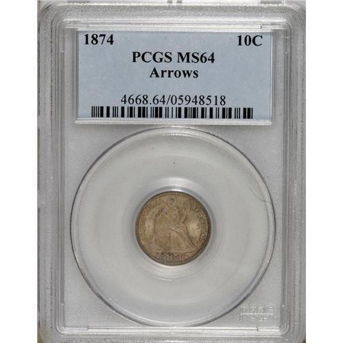 <B>1874 10C Arrows MS64 PCGS.</B></I> This near-Gem dime displays soft luster on light gray surfaces that are tinged with orange and cobalt-blue. The design elements are well struck, indeed better than average for the date; Liberty's head, often weak, is quite nicely defined on this coin. A few light marks account for the grade. Population: 42 in 64, 46 finer (2/07).<BR><BR><b>Shipping:</b> Coins & Currency (<a target="_blank" href="http://www.heritageauctions.com/common/shipping.php">view shipping information</a>)