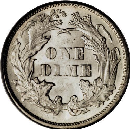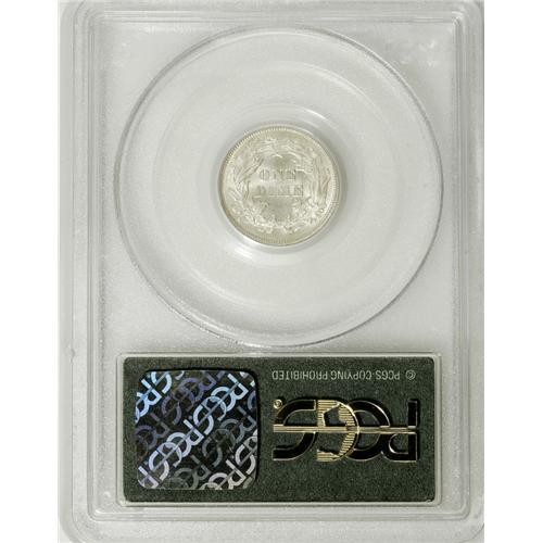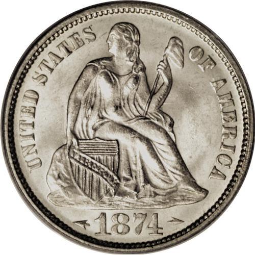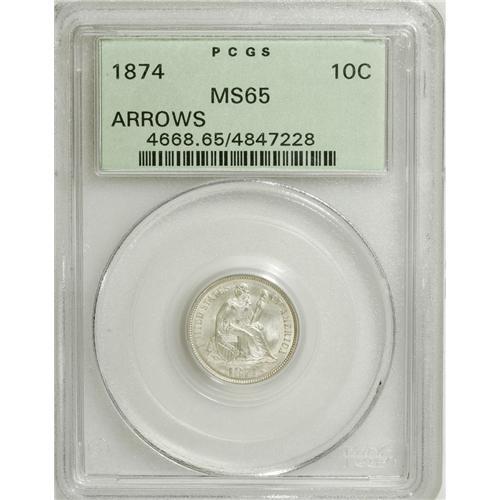 <B>1874 10C Arrows MS65 PCGS.</B></I> This satiny and nearly untoned Gem is well struck except for the usual minor weakness on the upper left portion of the wreath. The reverse field has light grazes. Desirable as a type coin, since Motto Arrows dimes were struck for only two years. Encased in a green label holder. Population: 21 in 65, 25 finer (2/07).<BR><I>From The Palakika Collection.</B></I><BR><BR><b>Shipping:</b> Coins & Currency (<a target="_blank" href="http://www.heritageauctions.com/common/shipping.php">view shipping information</a>)
