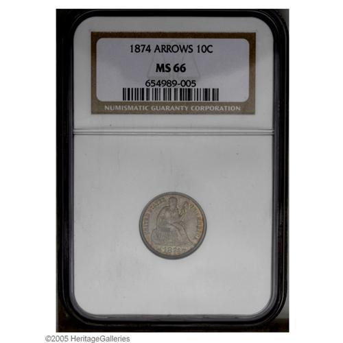 <B>1874<10C> Arrows MS66 NGC.</B></I> The gently toned obverse has champagne peripheral colors that flow into a darker grey-blue center. The reverse cries out with a gorgeous coral-green halo that evolves into that grey-blue center that graces the obverse side. Minimal marks with luster lurking beneath the tone make this coin sure to please.