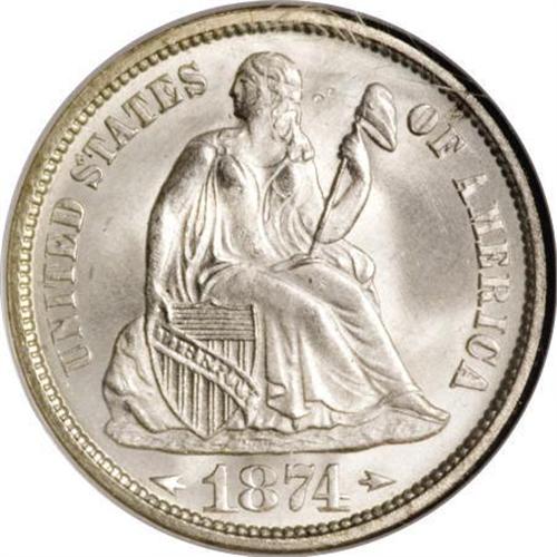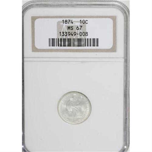 <B>1874 10C Arrows MS67 NGC.</B></I> The weight of minor silver coins was increased only marginally in 1873. The dime went from 2.49 grams to 2.50 grams. Unlike the more dramatic tenor change in 1853, the 1873 modification was not made because of a change in the gold-silver value ratio; instead, the mint director wanted to use more convenient metric weights. As in 1853, arrows were added to the date to indicate the change in weight. 1874 is the second and final year of the two-year Arrows, Obverse Legend subtype. Nearly 3 million pieces were struck, and Uncirculated examples are always available, but few Superb Gems are known. This brilliant and satiny example is unusually smooth, and the strike is sharp throughout. Census: 4 in 67, 2 finer (1/08).<BR><I>From The Southwest Collection.</B></I><BR><BR><B>Coin Engraver:</B> Christian Gobrecht<BR><BR><b>Shipping:</b> Coins & Currency (<a target="_blank" href="http://www.heritageauctions.com/common/shipping.php">view shipping information</a>)