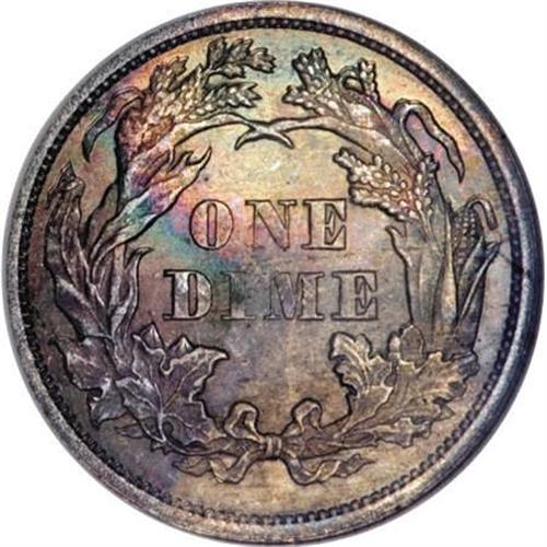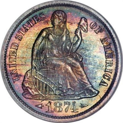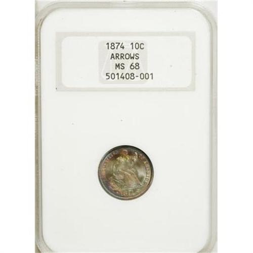 <B>1874 10C Arrows MS68 NGC.</B></I> The increase in weight from 2.49 grams to 2.50 grams resulted in arrows being placed at the date of the 1873-1874 Seated dime issues. While the branch mint deliveries are scarce to rare in all grades, P-mint representatives are encountered with enough frequency to serve as type coins for most collectors. This status does not, however, apply to the present Superb Gem. One of only three MS68 examples known to both NGC and PCGS (12/07), this coin exudes both originality and perfection. Both sides are richly frosted and free of even the most trivial abrasion. In addition to its technical superiority, this coin's gorgeous toning scheme also places it head and shoulders above all 1874 Arrows dimes that we have handled in recent memory. Streaks of crimson-lavender, blue-green, and cobalt-blue color are noted over the otherwise golden patina on the obverse. The reverse displays a similar golden-gray colored base with a swath of charcoal-cobalt, crimson-lavender, and electric-blue toning over the left quadrant. A coin of singular beauty. <BR><I>Ex: Philadelphia 2000 (8/2000), lot 6944.</B></I><BR><BR><B>Coin Engraver:</B> Christian Gobrecht<BR><BR><b>Shipping:</b> Coins & Currency (<a target="_blank" href="http://www.heritageauctions.com/common/shipping.php">view shipping information</a>)