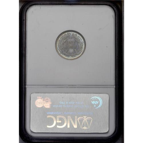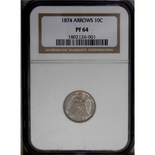 <B>1874<10C> Arrows PR64 NGC.</B></I> One of 700 proofs struck for the year and an important two-year type. This specimen reveals soft cobalt-blue and lavender toning over proof surfaces that exhibit sharply struck design elements. A couple of tiny marks are noted on Liberty's cheek and neck.