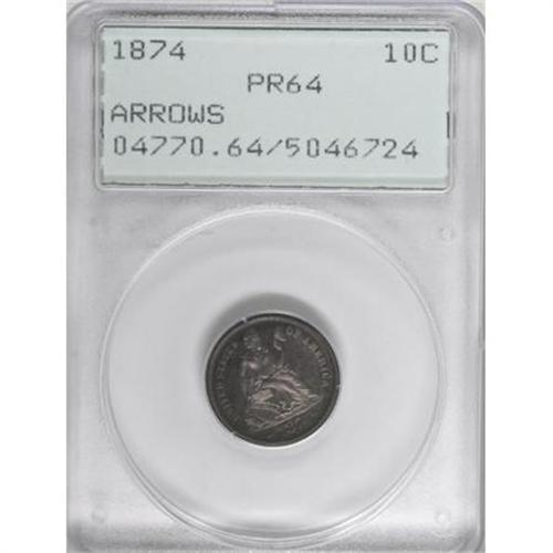 <B>1874 10C Arrows PR64 PCGS.</B></I> Dusky emerald-green and rose-gray toning drapes this suitably struck and mark-free proof type coin. Housed in a first generation holder. A mere 700 proofs were struck.<BR><BR><B>Coin Engraver:</B> Christian Gobrecht<BR><BR><b>Shipping:</b> Coins & Currency (<a target="_blank" href="http://www.heritageauctions.com/common/shipping.php">view shipping information</a>)
