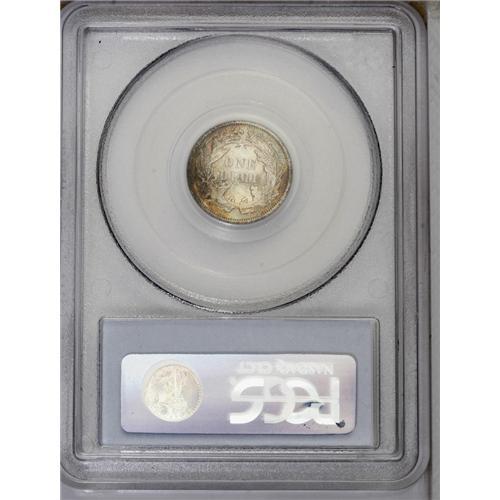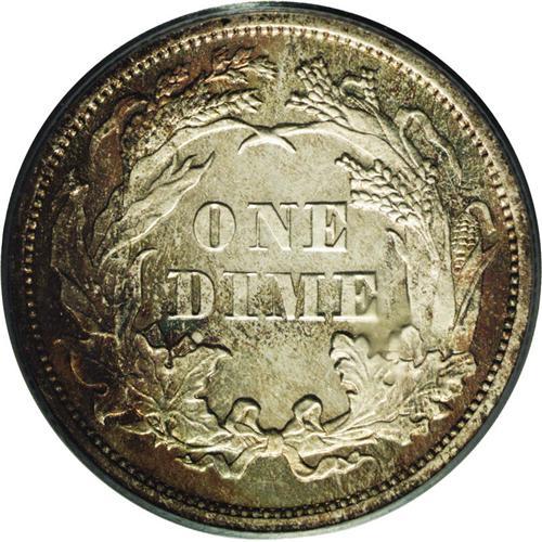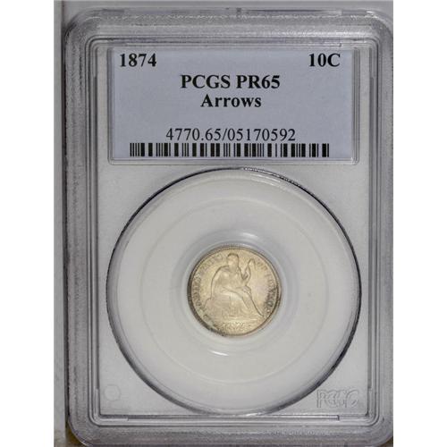 <B>1874<10C> Arrows PR65 PCGS.</B></I> A watery Gem that is mostly brilliant through the centers and shows intermittent coppery-gold and mint-green peripheral toning. Only a small percentage of the 700 proofs issued survive this nice and its importance as a type coin is paramount. Population: 16 in 65, 8 finer (3/06).