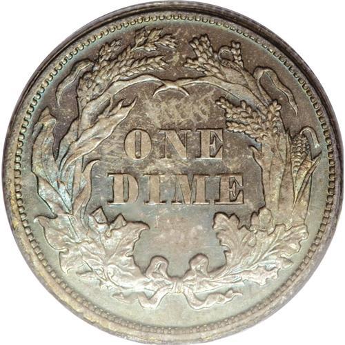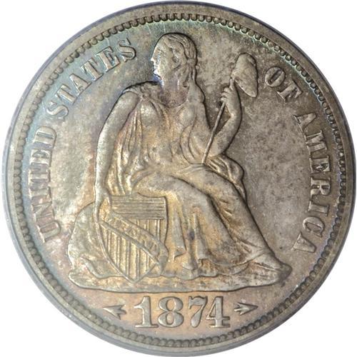 <B>1874 10C Arrows PR65 PCGS.</B></I> This decisively struck Gem exhibits vivid peach, ocean-blue, and lime shades. The well-preserved surfaces gleam beneath the toning. One of just 700 proofs struck, and part of the two-year Arrows, Legend Obverse subtype, always popular with collectors. Population: 16 in 65, 8 finer (4/07).<BR><BR><b>Shipping:</b> Coins & Currency (<a target="_blank" href="http://www.heritageauctions.com/common/shipping.php">view shipping information</a>)