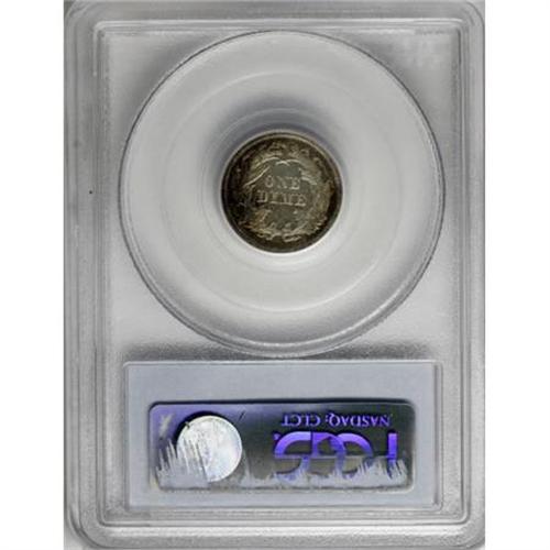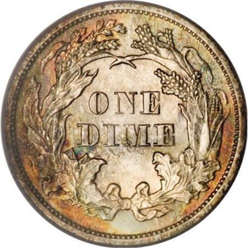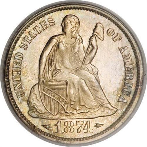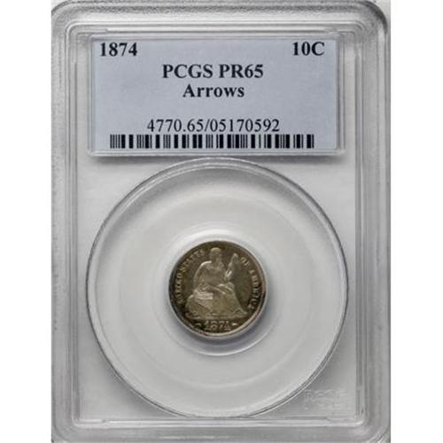 <B>1874 10C Arrows PR65 PCGS.</B></I> This watery Gem is mostly brilliant aside from intermittent coppery-gold and mint-green peripheral toning. Precisely struck and undisturbed. Only a small percentage of the 700 proofs issued survive this nice, and its importance as a type coin is paramount. Population: 16 in 65, 8 finer (12/07). <BR><BR><B>Coin Engraver:</B> Christian Gobrecht<BR><BR><b>Shipping:</b> Coins & Currency (<a target="_blank" href="http://www.heritageauctions.com/common/shipping.php">view shipping information</a>)
