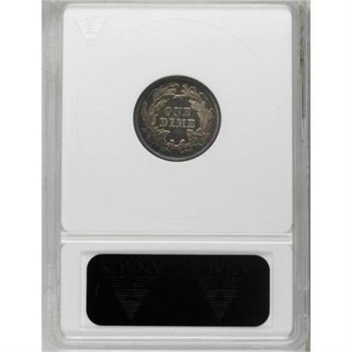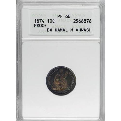 <B>1874 10C Arrows PR66 ANACS.</B></I> Ex: Kamal M. Ahwash. Even more vividly toned than the preceding Gem, this deeply reflective specimen is notable for orange, rose, and sea-green iridescent shades that lighten to near-brilliance at the center of the reverse. Between the coin's well known pedigree and its importance as a two-year type representative, commensurate collector demand should follow.<BR><BR><B>Coin Engraver:</B> Christian Gobrecht<BR><BR><b>Shipping:</b> Coins & Currency (<a target="_blank" href="http://www.heritageauctions.com/common/shipping.php">view shipping information</a>\)