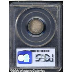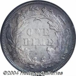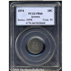 <B>1874<10C> Arrows PR66 PCGS.</B></I> One of 700 proofs struck for the year and an important two-year type, particularly in Gem grades. This is one of the finest examples known and certified. The mirrored fields are only moderately reflective because of the deep sea-green and gray toning that covers most of each side. The centers show a smidgen of smoky-gray color that provides some contrast against the overall green color of the coin. A pristine example of this short-lived type. Population: 8 in 66, 1 finer (7/04). <BR><BR><B>Important notice:</B> Heritage usually auctions material at the rate of 200-250 lots per hour. On some occasions eBay Live bid software or the Internet may not be able to keep up with the pace of the auction. We recommend placing a realistic absentee bid now as insurance to avoid disappointment. Occasionally the auctioneer may eliminate or reject an eBay Live bid, and the auctioneer may also reopen a lot after the close of the eBay live bidding (usually because we missed an audience bid), and may reject your bid even if it shows you as the winning bidder. By bidding via eBay Live, you agree that Heritage may award the lot to another bidder at its sole discretion under the circumstances described above or any other reasonable circumstances. Since eBay bids are not shown to us until we open the lot on the floor, we treat those bids just like floor bids. In most cases the floor responds before the eBay bid is presented to us, due to Internet lag time, so for consistency we have made it a policy that floor bids are always considered first over tie eBay live bids. Also please note that all Heritage lots purchased through eBay Live carry a 20% Buyer's Premium. Please make sure you read the Terms and Conditions before you bid. </span></font></tr></table></td></tr></table>