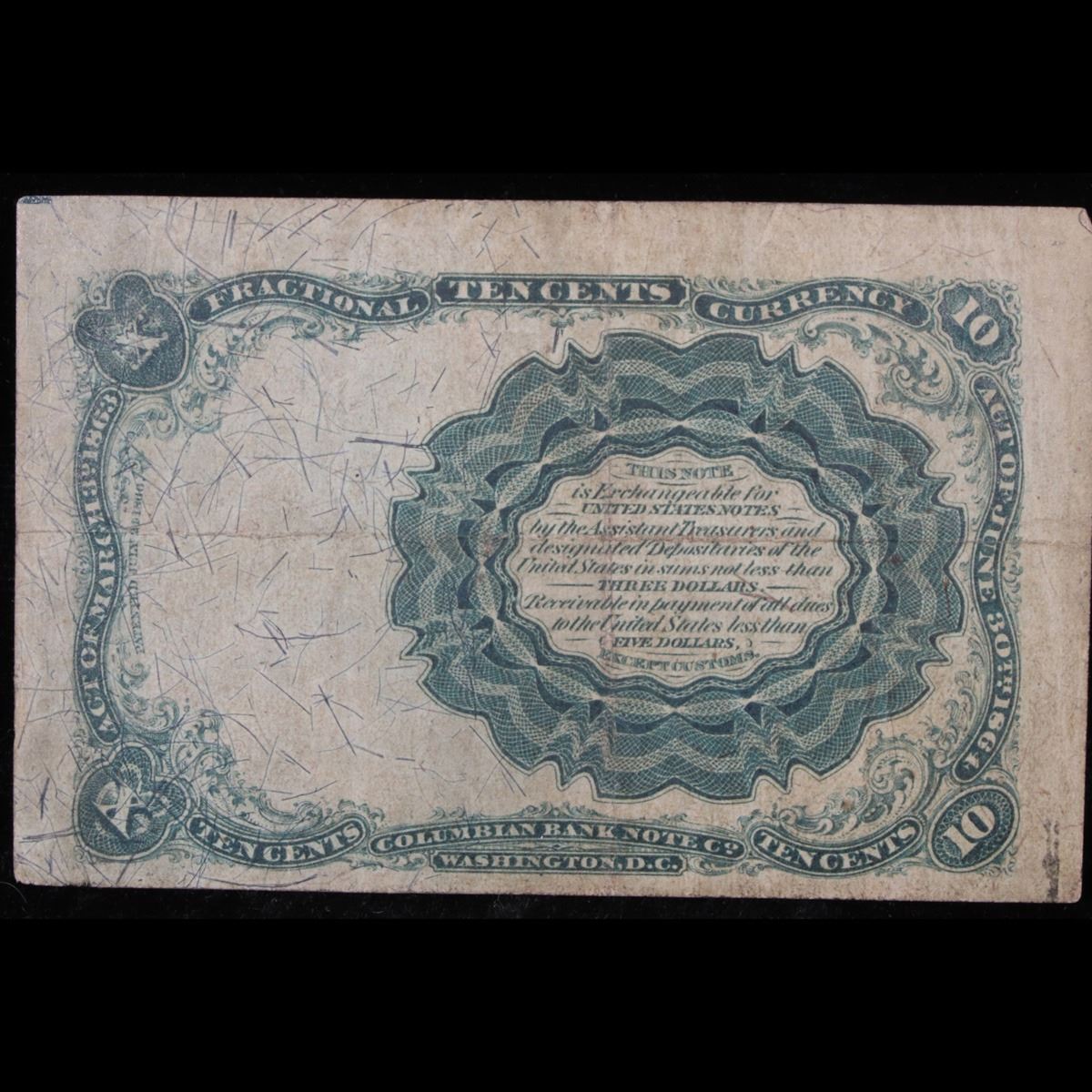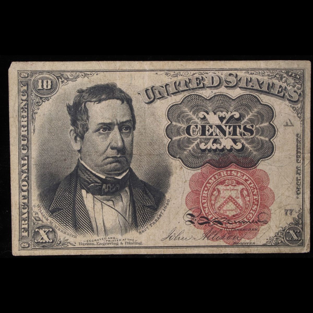 1874 10c Fractional Currency, 5th Issue, Short Key Grades vf++. FR# 1266. Fractional or postage currency has a rich history. At the beginning of the Civil War people starting hoarding coins for their precious metal content. Coins became difficult to find because of the hoarding. People started to try to use stamps instead of coins as a means of commerce. The government decided to help ease the hoarding issue by issuing “paper coins” also known as postage currency or fractional currency. Fractional currency was first issued on August 21, 1862 and they were last issued on February 15, 1876. Three cents, five cents, ten cents, twenty-five cents, and fifty cents notes were all issued. Fractional currency is physically smaller than other United States money. It also does not have a serial number. William Meredith is pictured on the front.