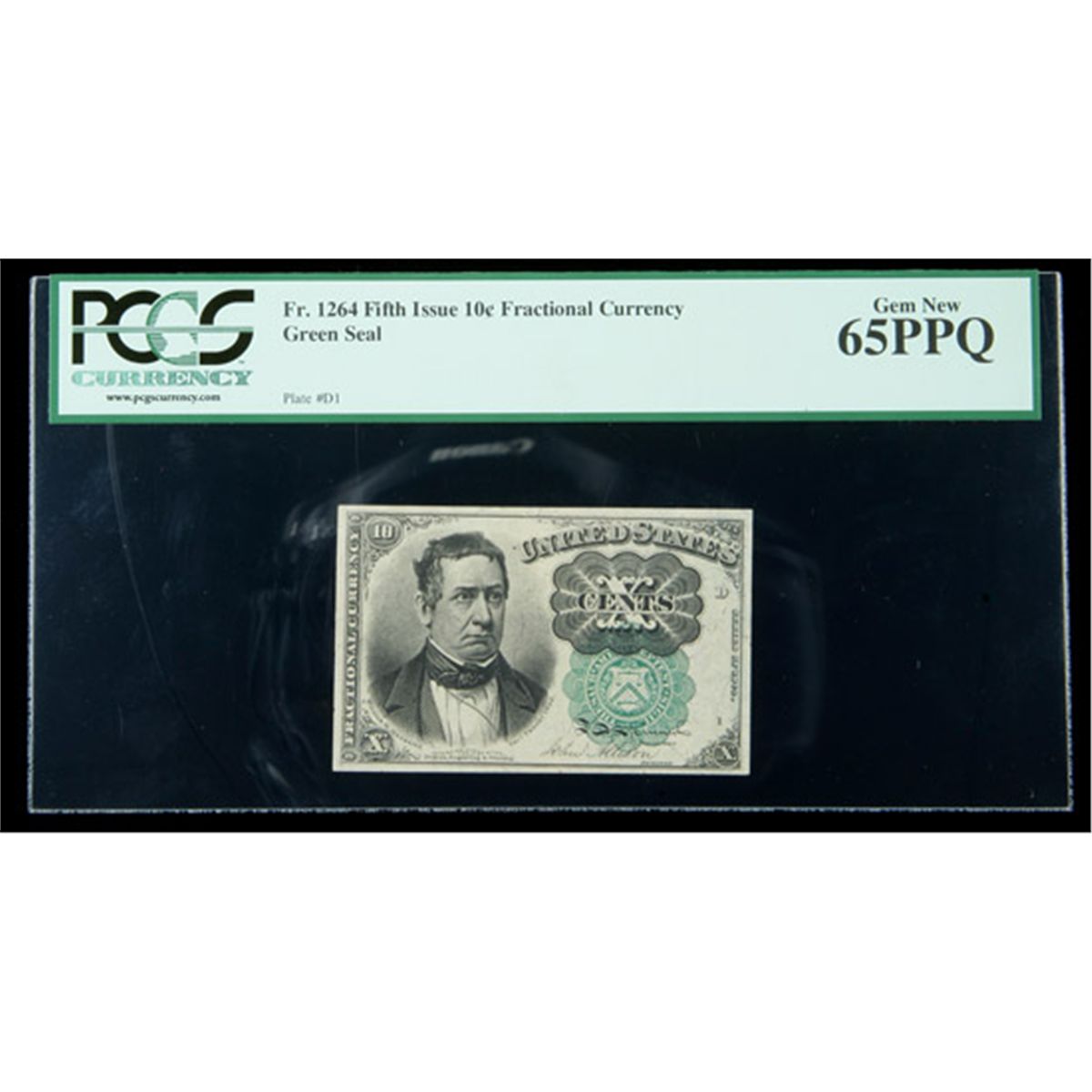1874, 10¢ Fractional Currency. Fifth Issue, green seal. PCGS Gem New 65PPQ. . Fr-1264. A lovely Green Seal Gem with a vivid green back.