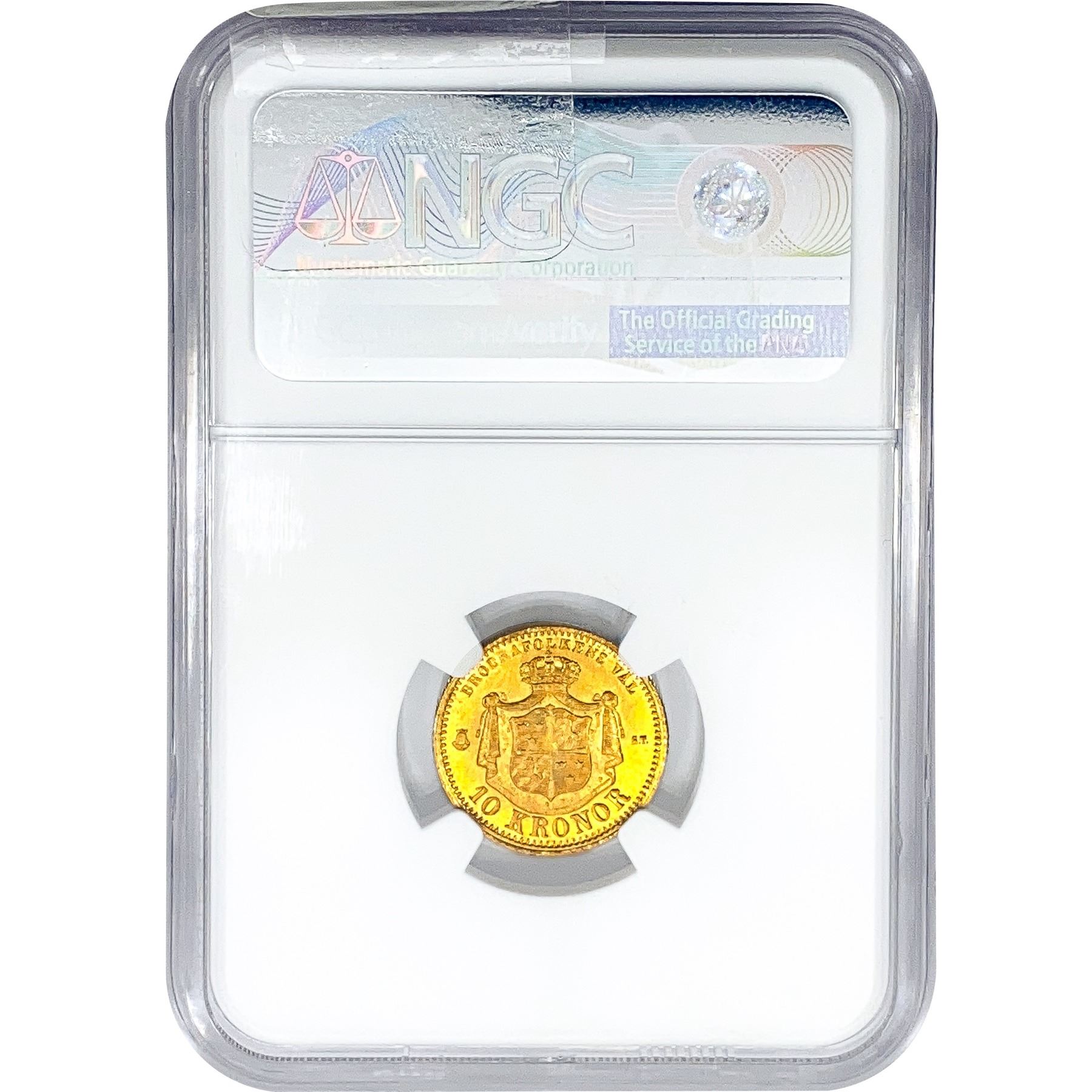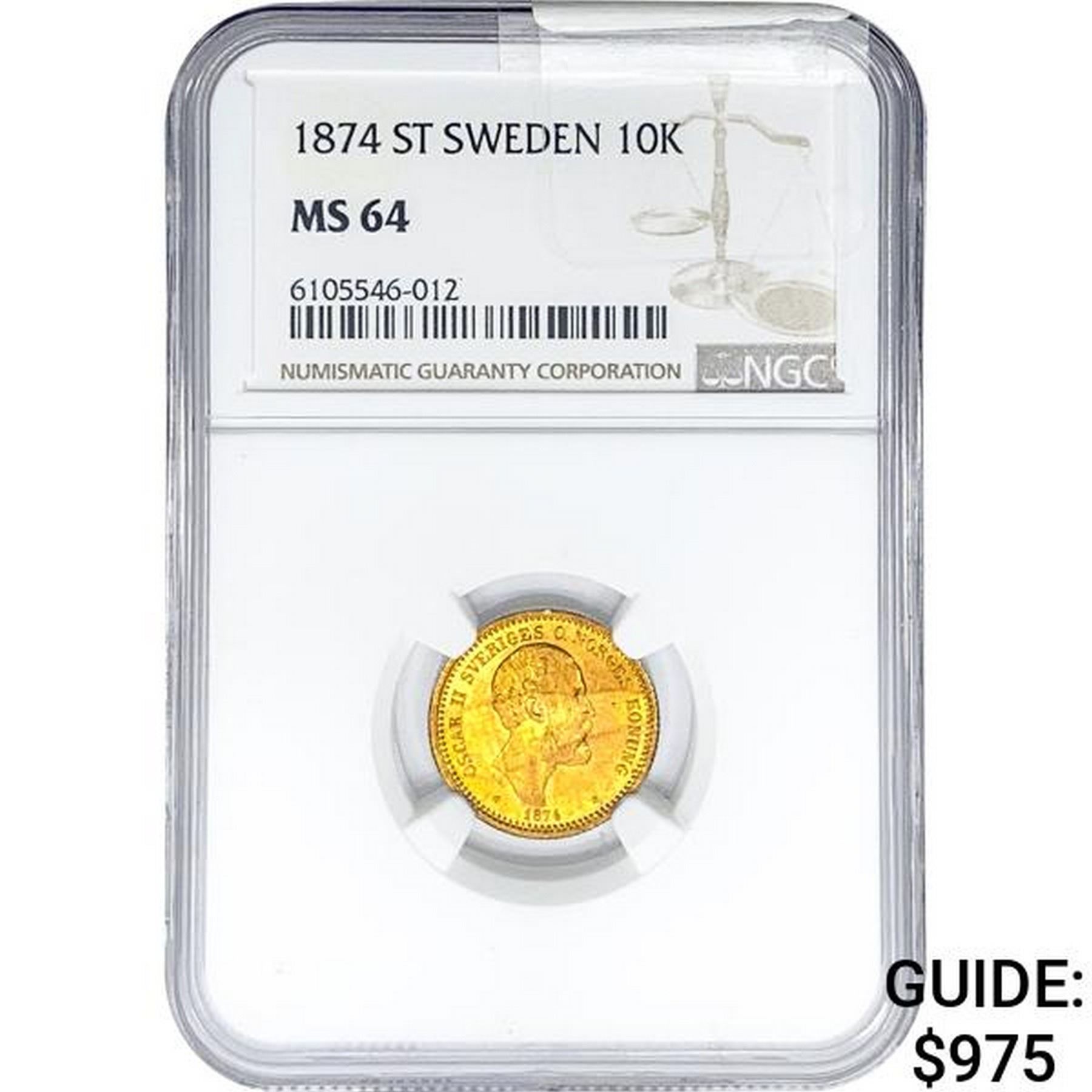 1874 .1296oz. Gold ST Sweden 10 Kroner NGC MS64